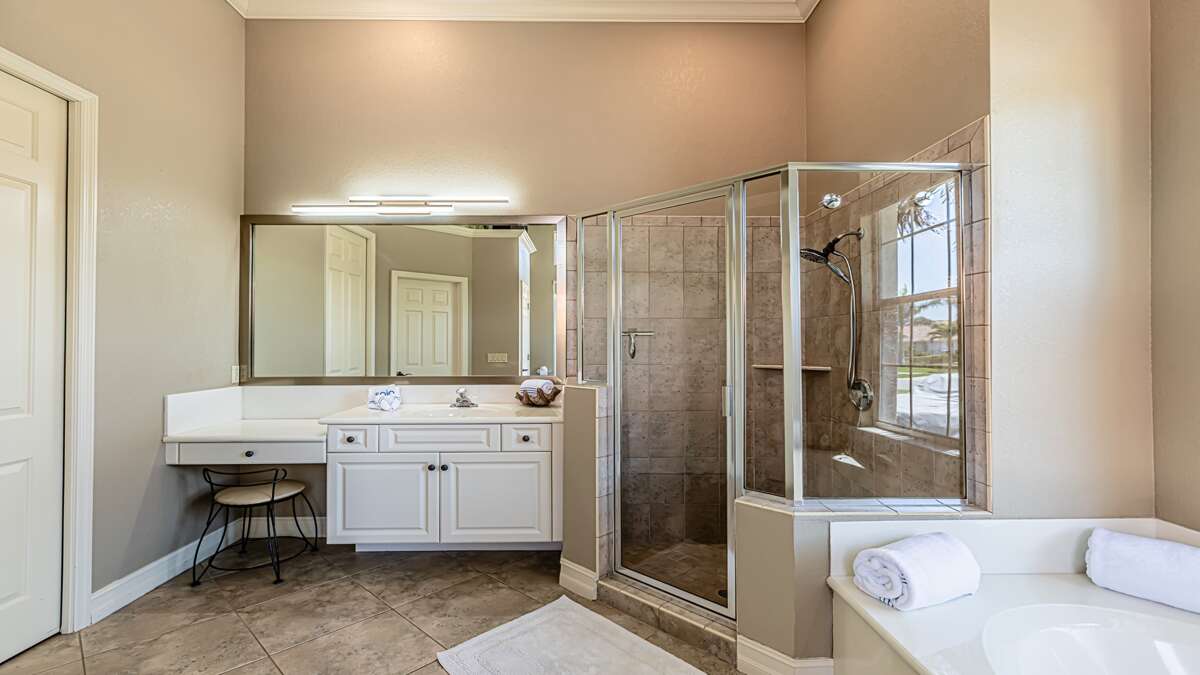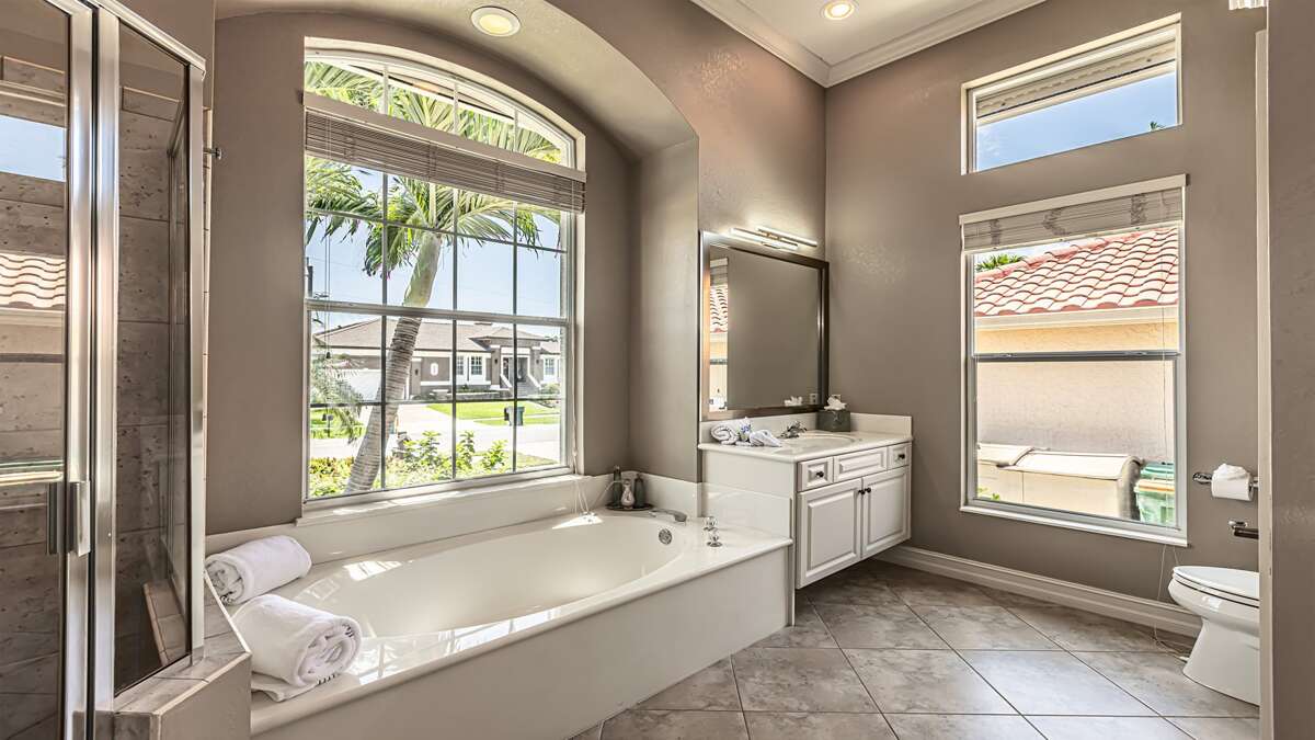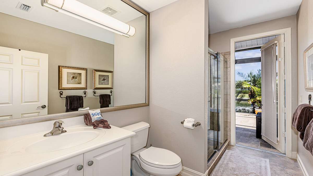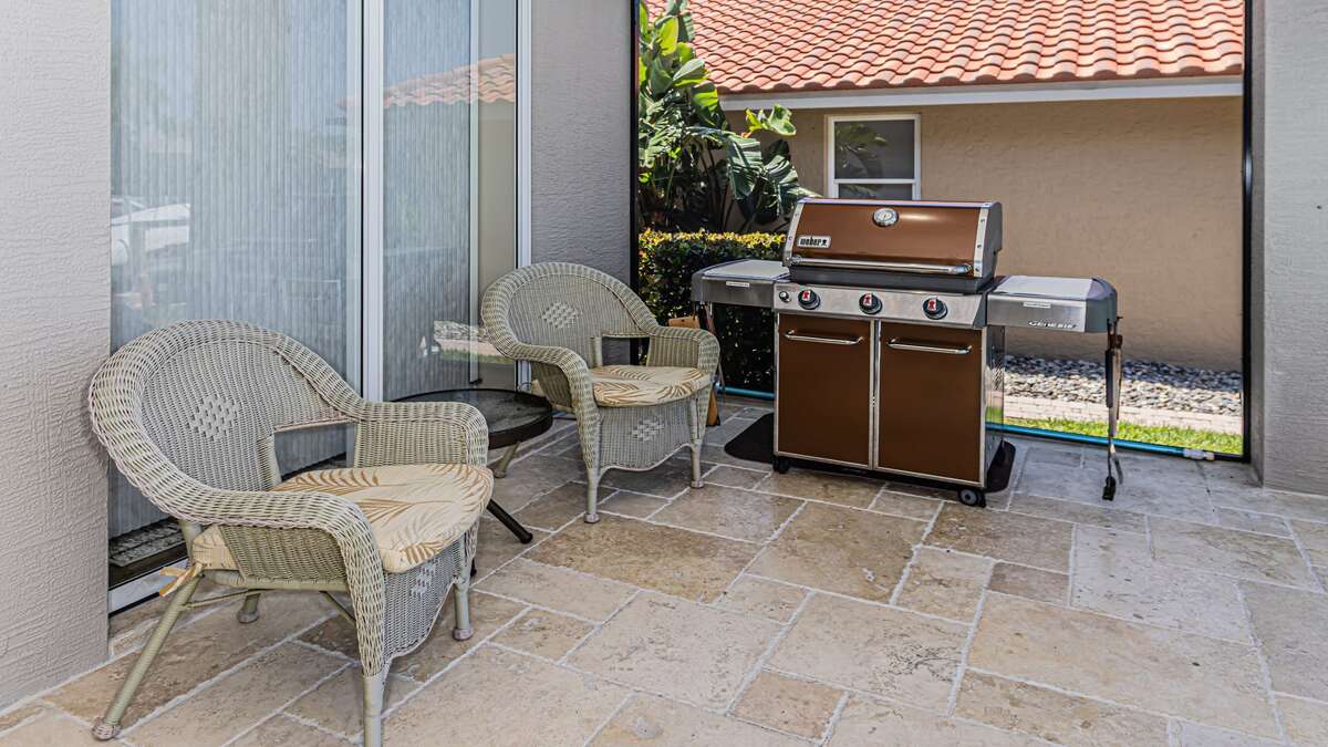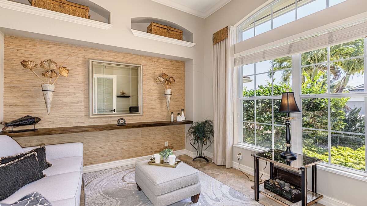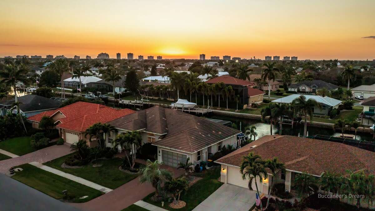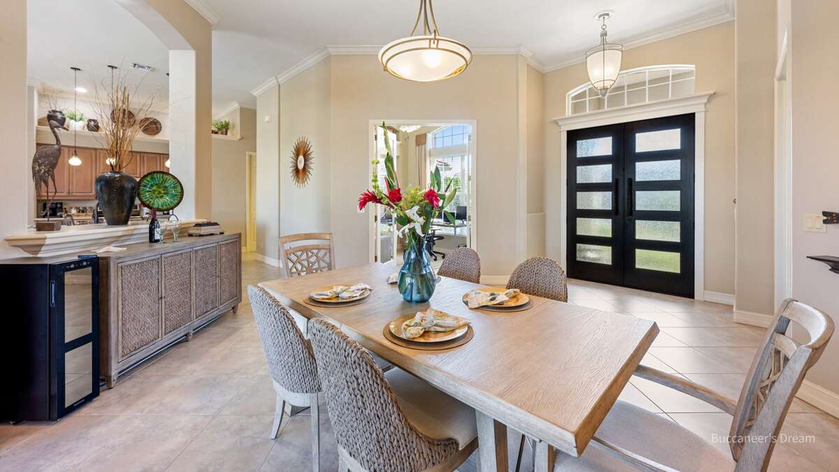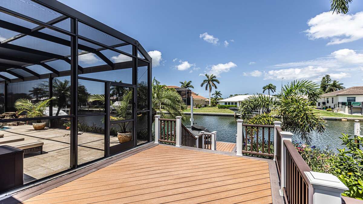 An exceptional 3 bedroom/2 bath waterfront pool home with breathtaking sunset water views Nestled on a quiet cul-de-sac street, this three-bedroom plus office/den, two-full bathroom home spans 2,032 square feet and features an open split floor plan. This home features exquisite professional landscaping and outdoor lighting that enhances its curb appeal. Step through the stately double doors into an inviting foyer and discover soaring ceilings, recessed lighting, crown molding, tile flooring in living areas, luxury vinyl wood flooring in bedrooms, an open floor plan and natural light throughout – creating a seamless and timeless aesthetic. To the right of the foyer, you’ll find a versatile den/study for those on a working vacation. The formal dining area impresses with a tray ceiling and light-filled ambiance courtesy of a nearby glass slider. The heart of the home lies in the adjacent kitchen, equipped with stainless appliances, wood cabinetry with under-lighting, quartz and stone countertops, and a large center island. with stainless steel appliances. A pantry provides ample storage, while the kitchen opens gracefully into the family room, where panoramic windows and dual glass sliders frame the sparkling pool and canal views. The primary bedroom suite is a tranquil escape with a king bed, a French door entry, a glass slider for private lanai access, a tray ceiling, luxury vinyl wood plank floors, and a spacious walk-in closet with built-in cabinets. The en-suite bathroom boasts his and her vanities, a makeup counter, framed full-width mirrors, a deep soaker tub, and a walk-in shower. Two additional guest bedrooms are generously sized, one king and one queen and share a full bathroom with a walk-in shower with stylish “barn-door” door. All bedrooms have TV's. Step outside to the lanai, a true haven for outdoor living, featuring travertine flooring, a heated pool with a serene water feature, and a picture window screen enclosure. Lounge by the pool while enjoying sunset cocktails and grilling your fresh catch.