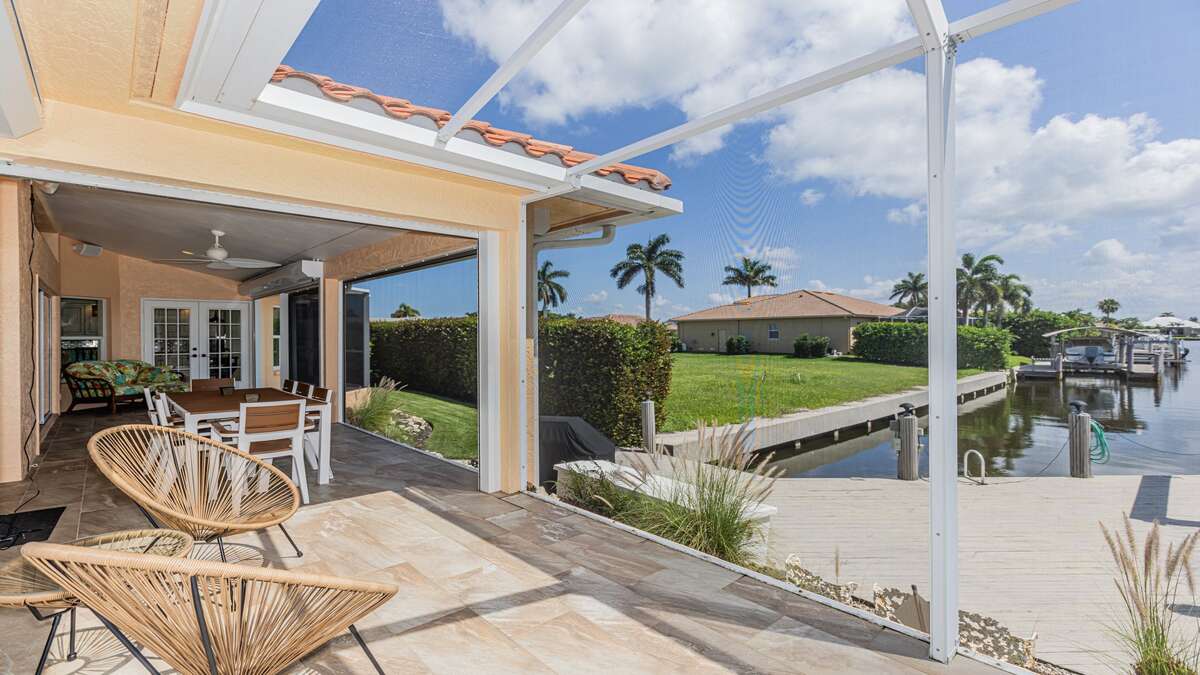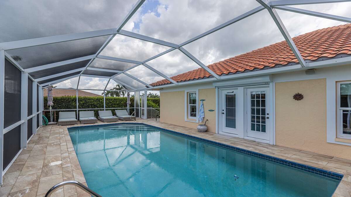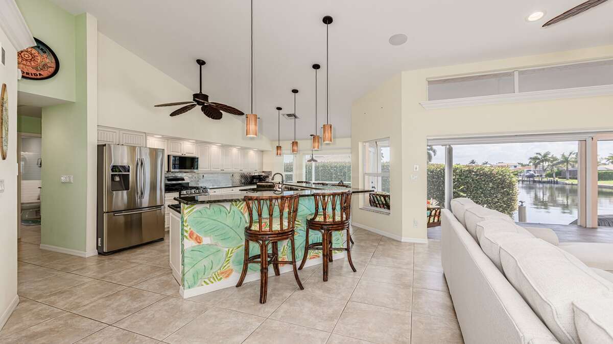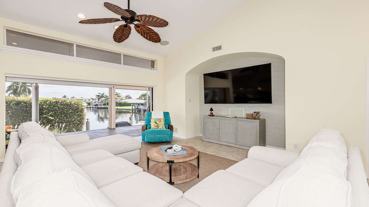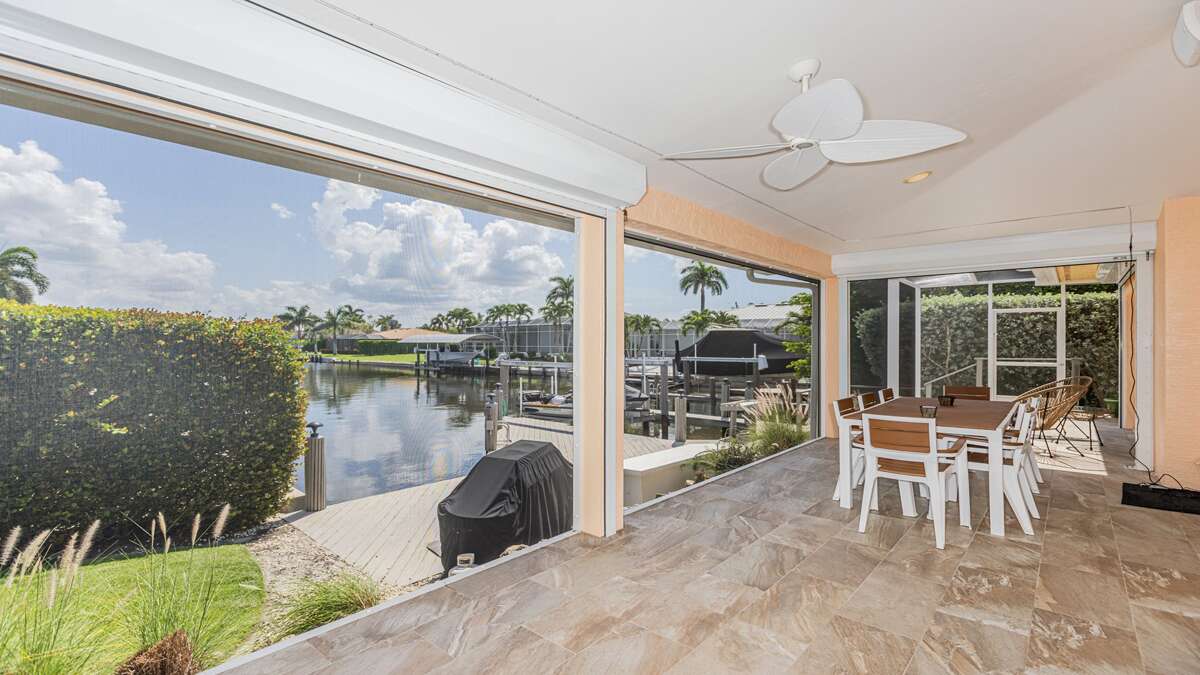 Beautiful 3 bedroom/2 bath waterfront pool home with long water view! Comfortable flowing floor plan with high ceilings, loads of windows & light and great exterior access from nearly every room. Superb location right in the heart of Marco Island, less than a mile to the YMCA, Mackle Park, shopping, and grocery store. Outstanding neighborhood of nice homes and quiet streets. Prefer a nice place to sit in the shade? This home has it with some of the lanai facing north. Love to sunbathe? The pool at this home wraps around the south and west side for all day sun and an easily accessible bathroom. The interior of this great room floor plan home makes it perfect for entertaining. Featuring an updated cook's dream kitchen with double oven, loads of counter space, ample bar seating for guests, excellent lighting, and stainless appliances and gas stove. There is a whole house sound system and home theater with a 70-inch TV and sound system in the living/dining area. The primary bedroom is extremely spacious with a king size bed and TV. South facing primary bath is nice and bright and includes double sinks and vanity, soaker tub, walk in shower, linen closet, and large walk-in closet. At the other end of the home are 2 guest bedrooms, the waterfront room features a king sized bed and TV and the other features full size bunk beds and a TV as well. These rooms share an updated coastal style bath with access to the pool.
