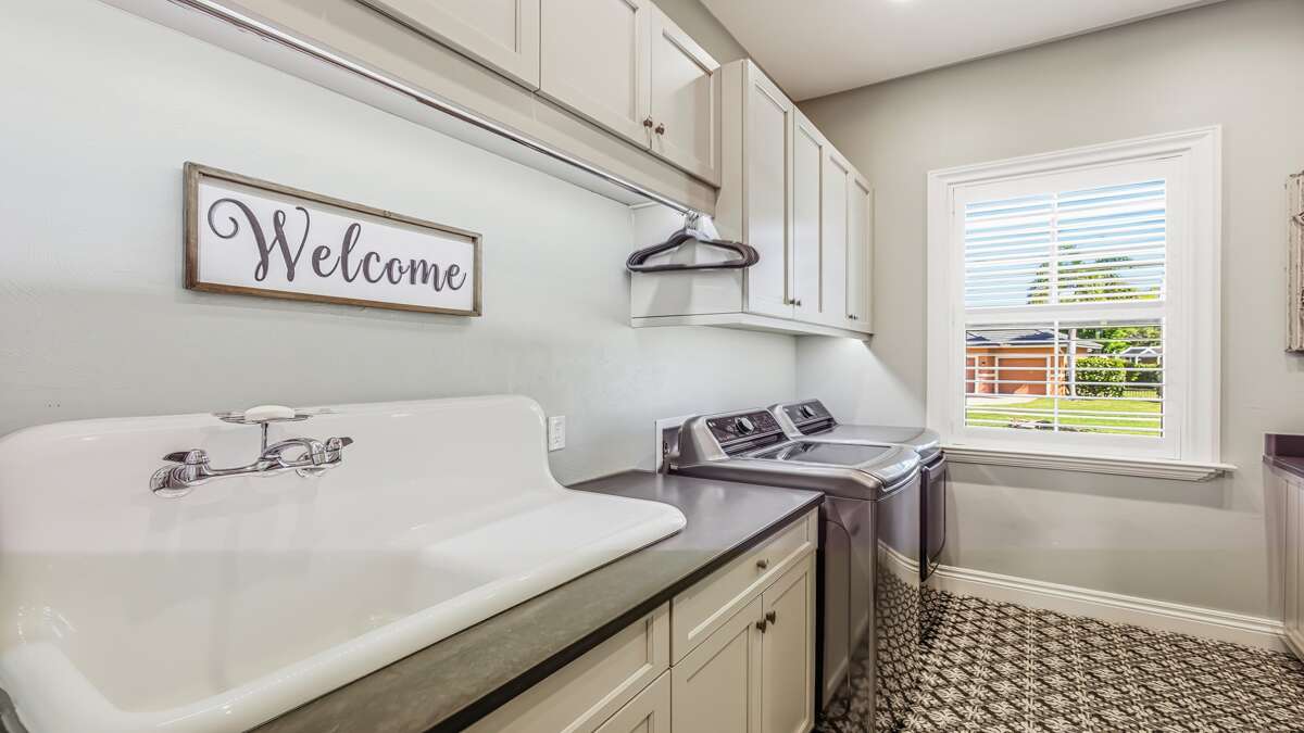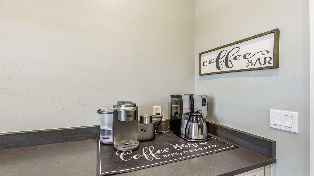 The open floor plan seamlessly transitions into a chef's dream kitchen, featuring top-of-the-line stainless steel appliances, a double oven, and a reverse osmosis water filtration system. The large island is the perfect place to prepare meals, play games, and create memories together. The dining room is the ideal place to gather, with seating for 8. The walk-in pantry provides ample storage space, along with a generous cabinet area to store all your groceries. A coffee bar is located in the spacious laundry room, where you can create your perfect cup of wake-me-up.