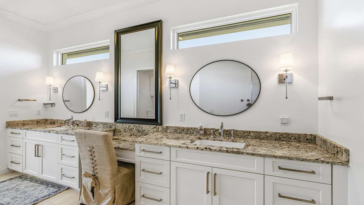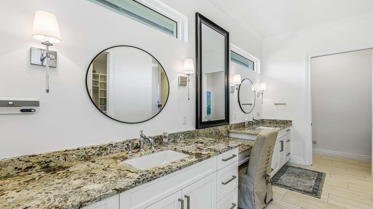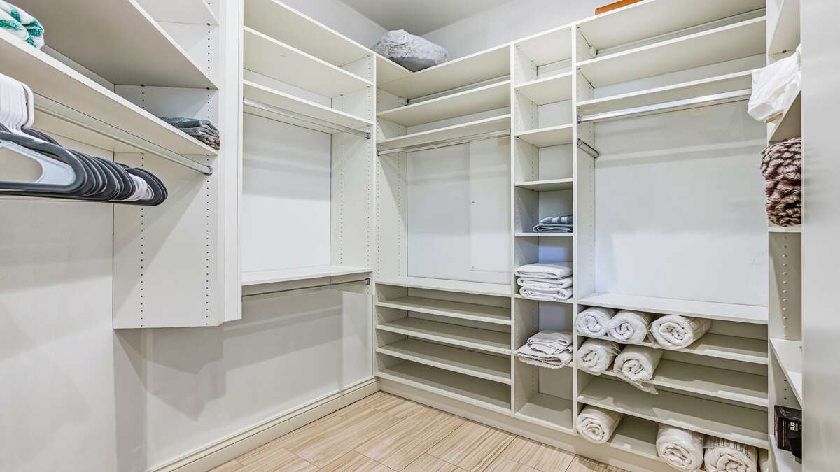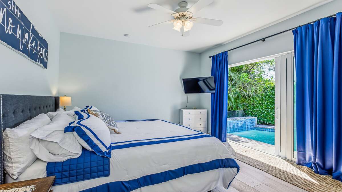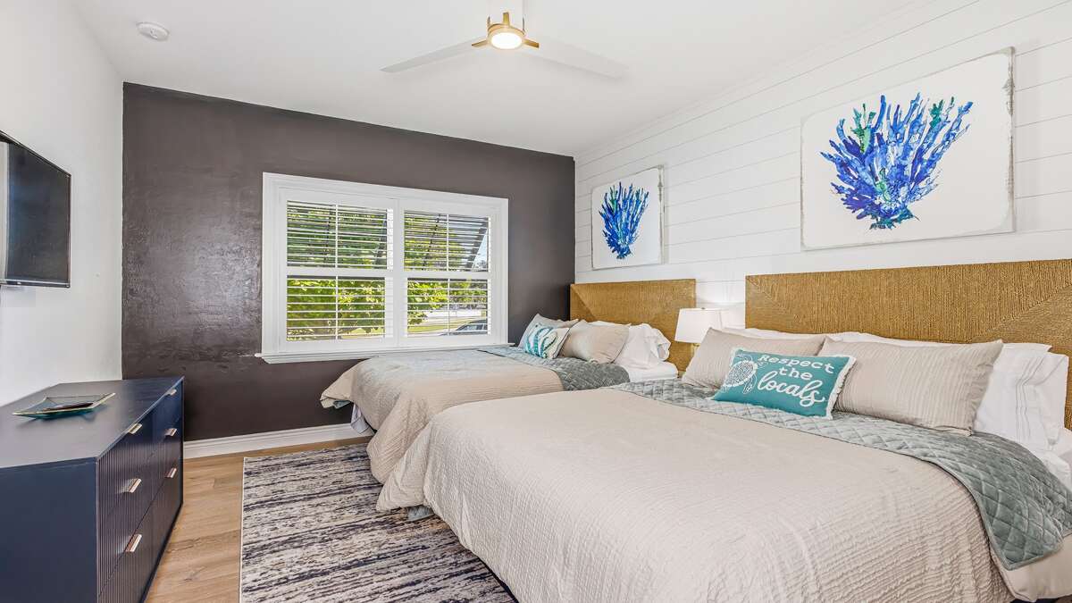 The split floor plan features the primary suite on its own private end of the home, complete with a King bed, dual vanities, a makeup station, a large walk-in shower with a rain showerhead, and a handheld shower head. The walk-in master closet features ample drawers and hanging space to accommodate all your clothing needs. Open the master sliding doors to access your private lounge area, featuring two chaise lounges. Two guest bedrooms located at the opposite end of the home share a lovely full bathroom with dual vanities, a tub, and a shower. One guest bedroom has two queen beds, and the other has a King bed. A pocket door closes off these rooms for more privacy. All the bedrooms are equipped with a TV for your viewing pleasure.
