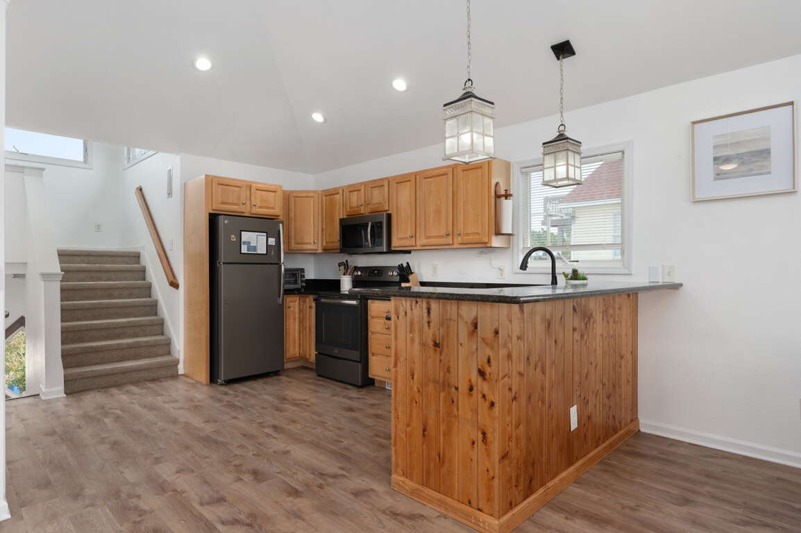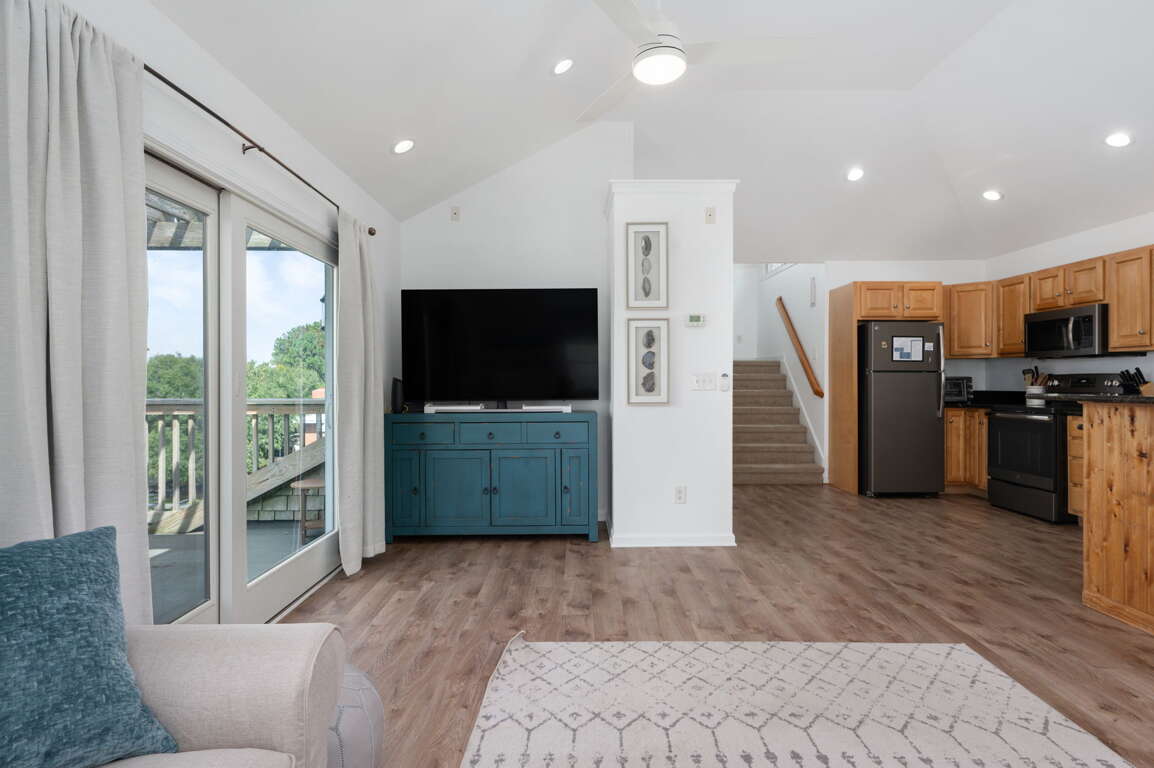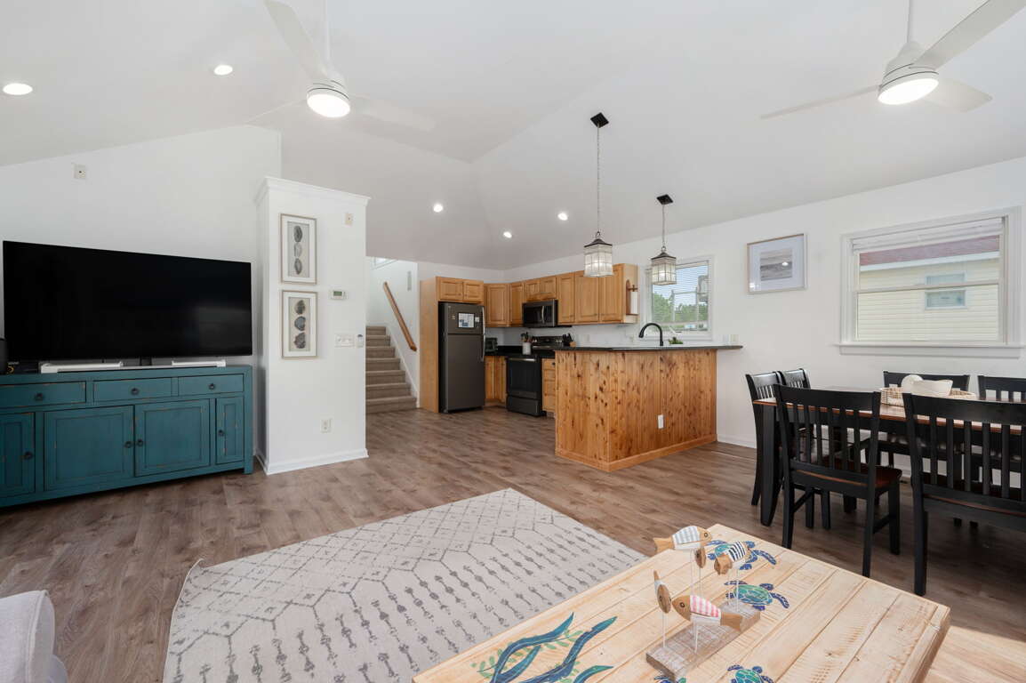 Top Level: Open concept Kitchen, Dining, and Living Area. Steps to small loft.