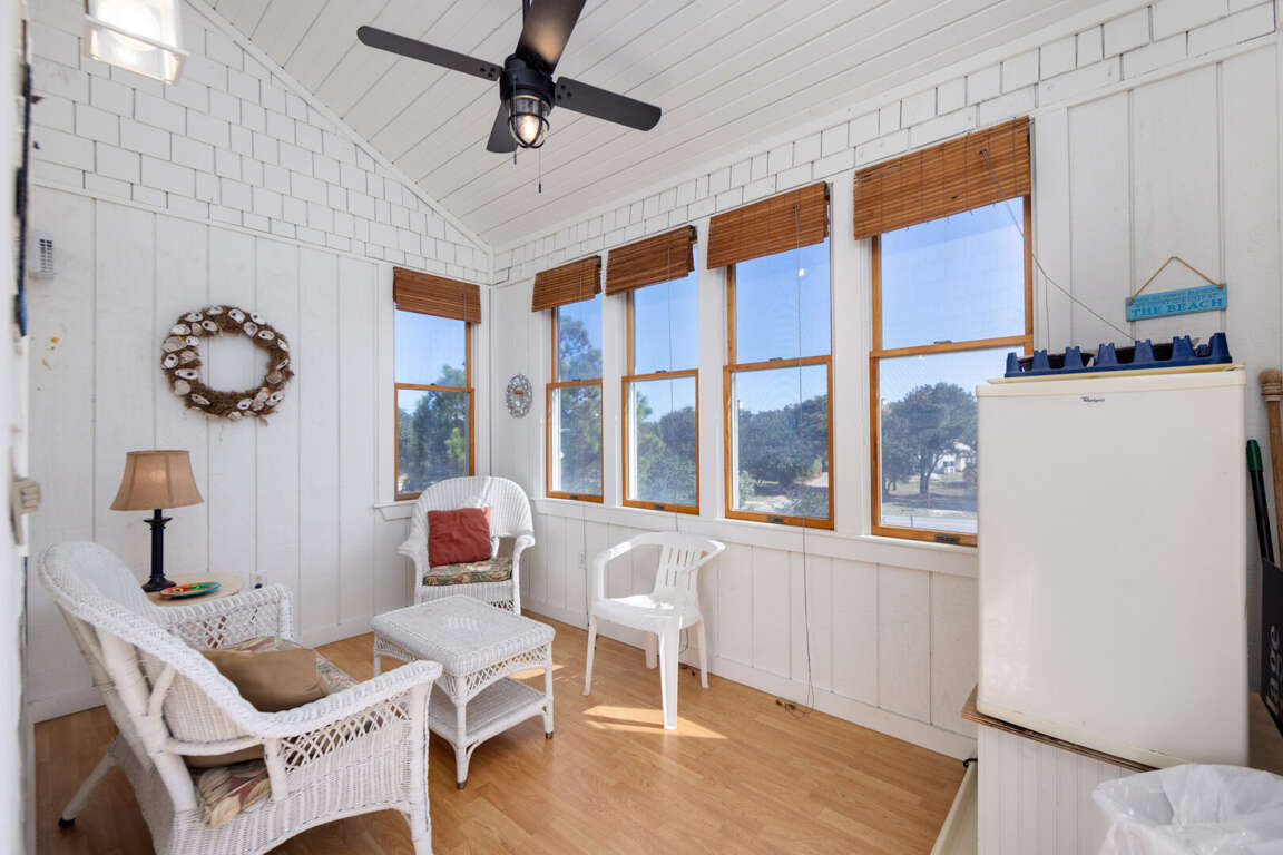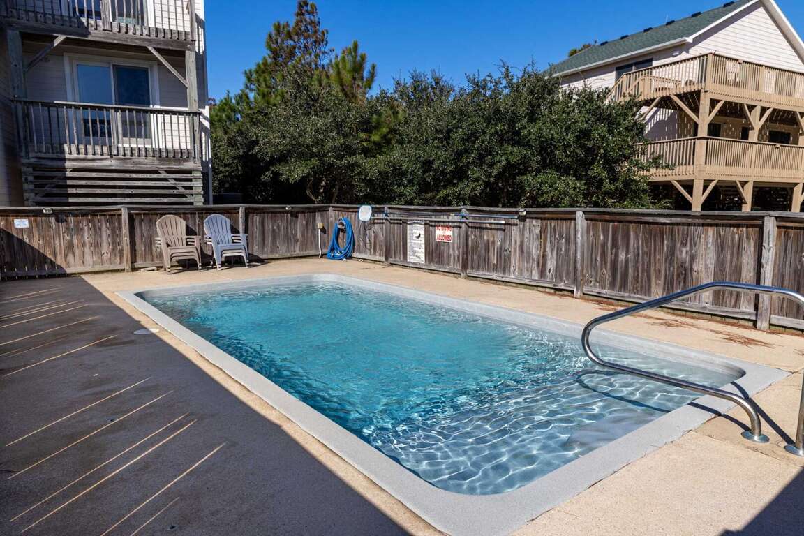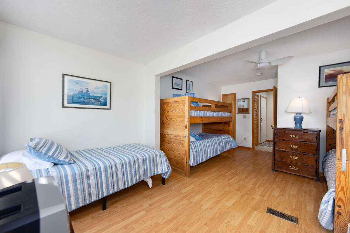 Enjoy the ocean breeze from the east-facing sunroom or soak up the sunshine on the wraparound sun decks that surround three sides of the top level. The lower level includes a large bedroom perfect for kids or groups, with two bunk beds and two twin beds. There are also two master bedrooms, each with a king bed. Outdoors, you'll find a private 12' x 24' gated pool, a screened-in sun porch with a mini fridge, and a relaxing whirlpool tub. Additional amenities include a carport swing, basketball goal, outdoor play set, enclosed outdoor shower with changing area, and a grill for cookouts.