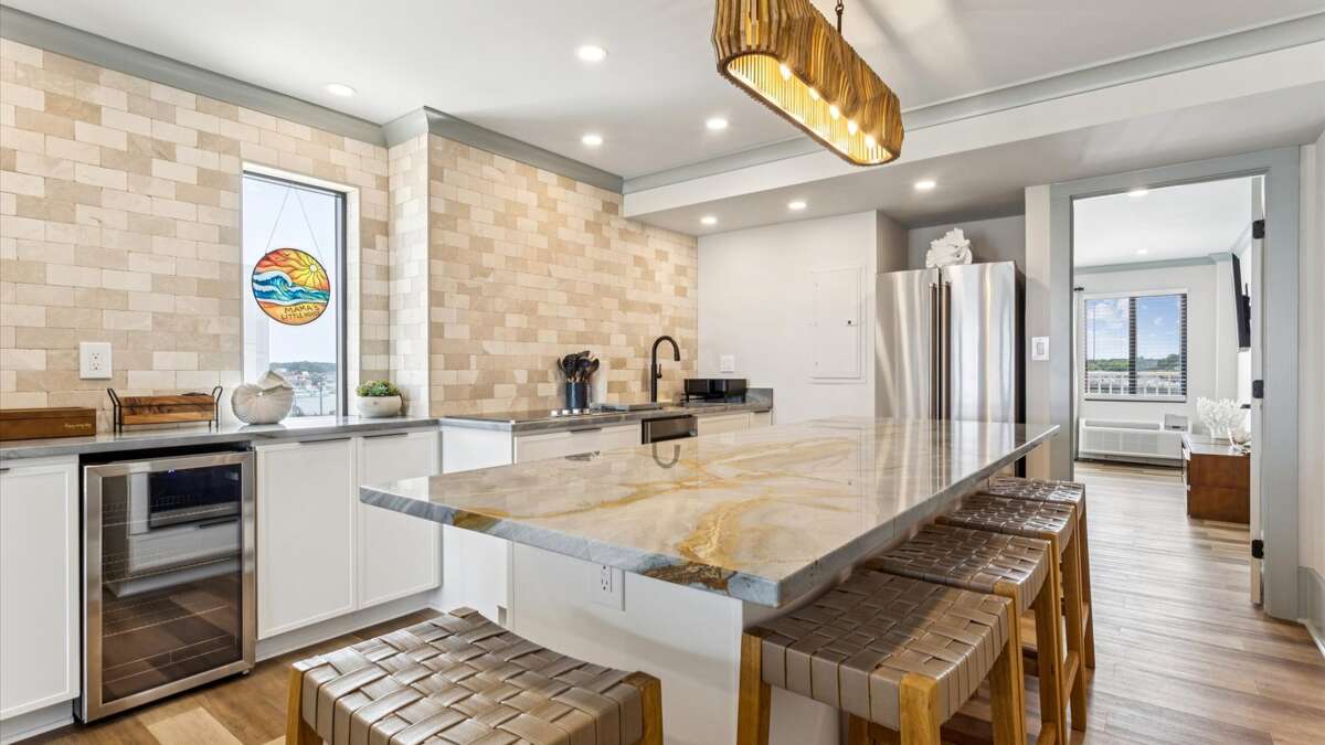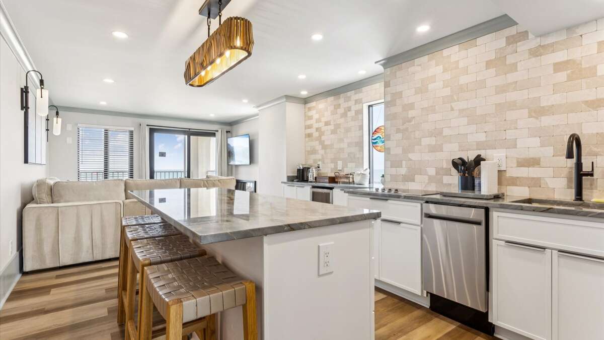 Full kitchen with stainless steel appliances & gorgeous large island<br />