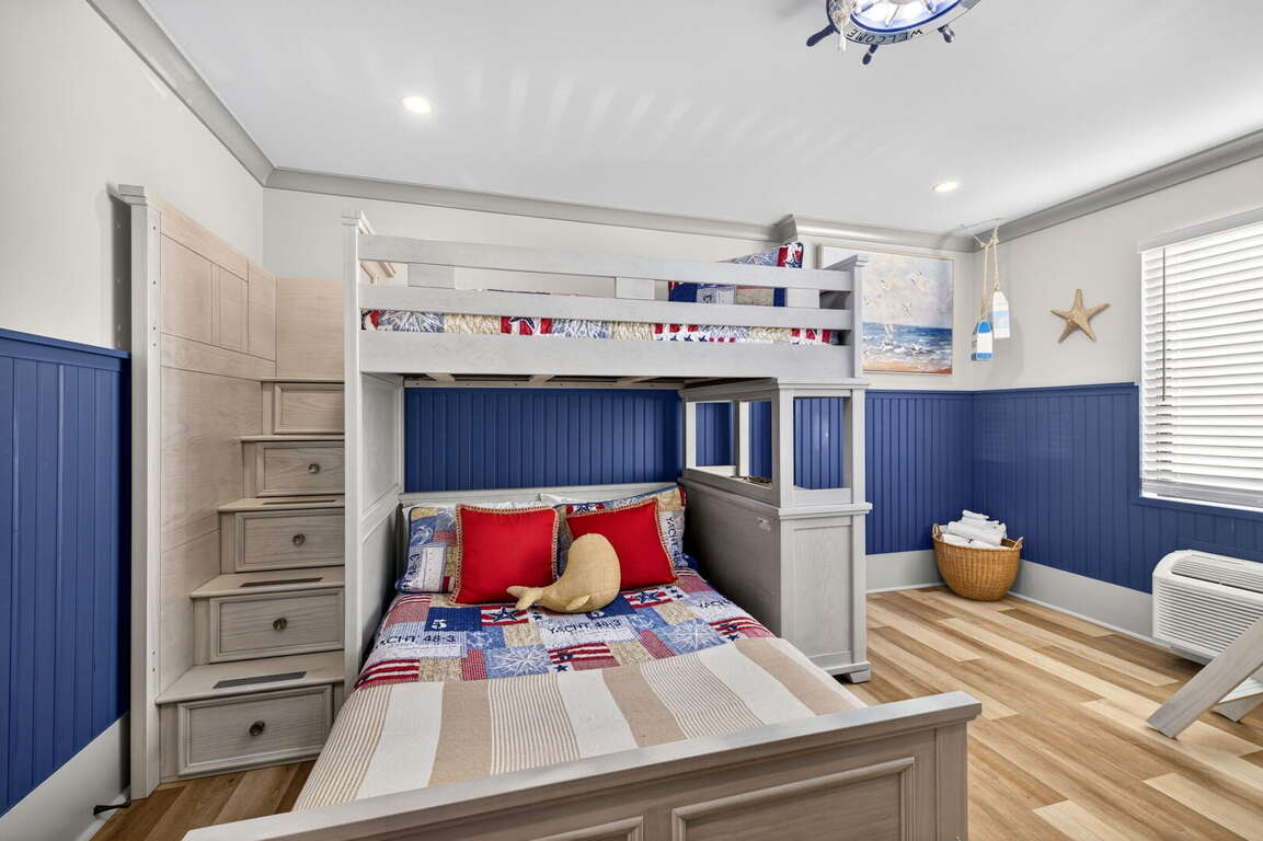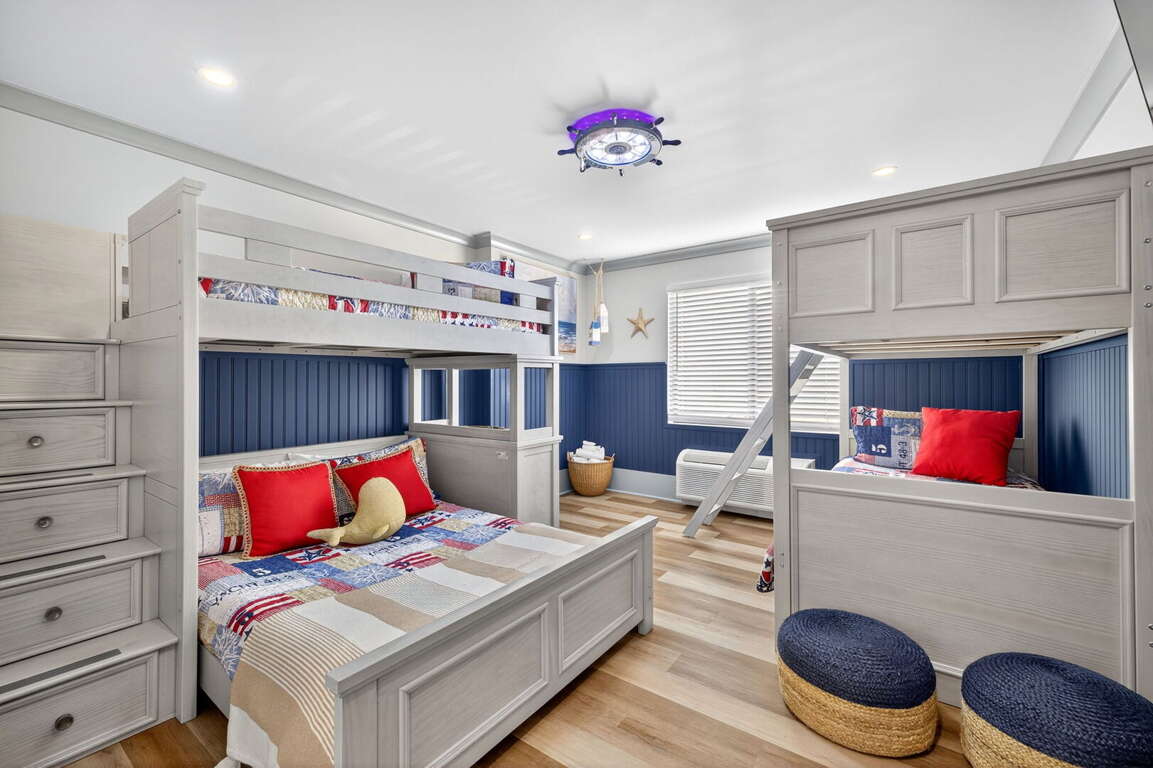 Double bunk setup: 3 twin beds + 1 full bed with Coastal sleeping essentials and bedding<br />