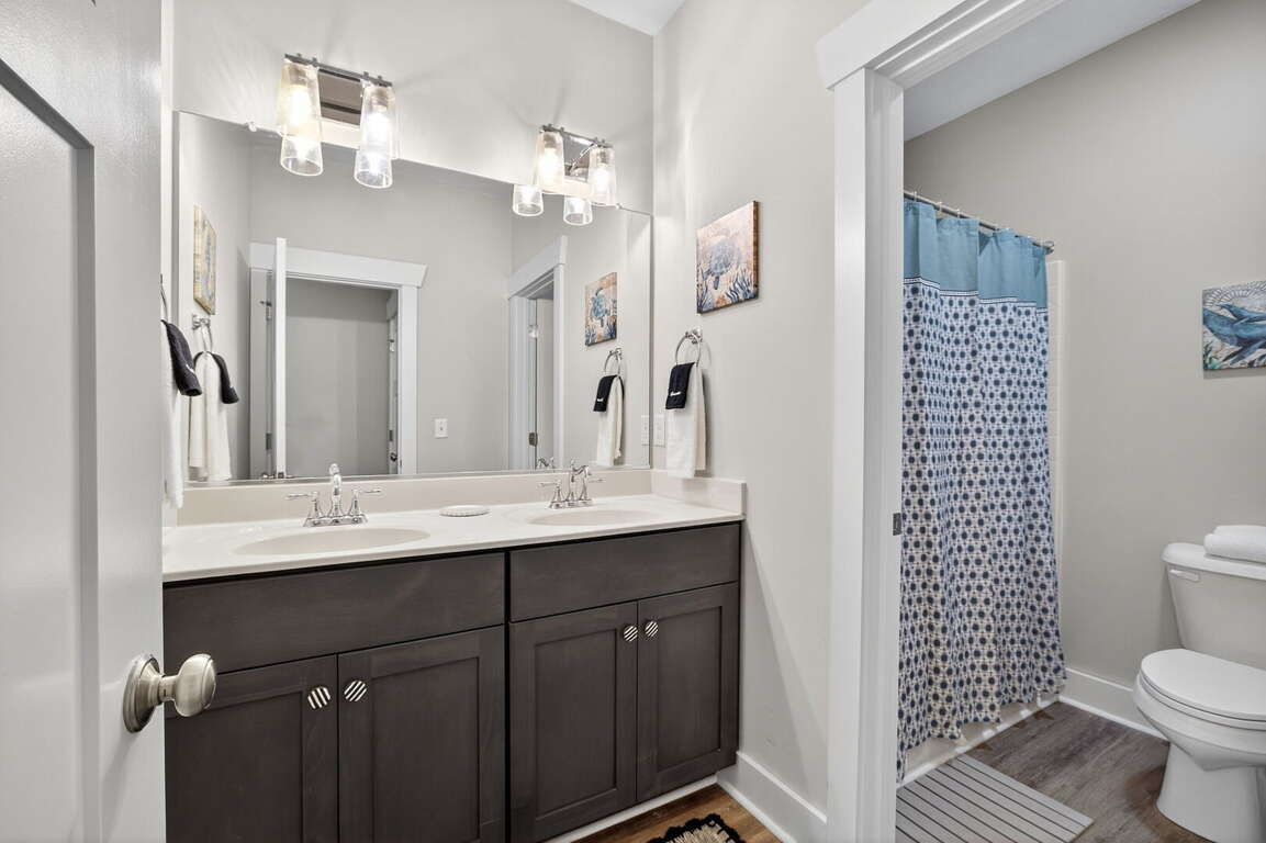 Hall Bathroom: Dual sinks + separate toilet/shower‑tub area for shared use<br />