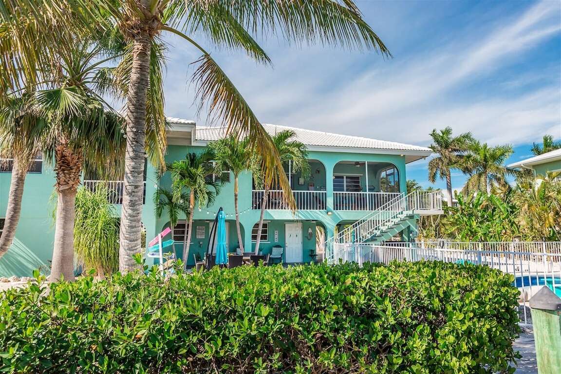 This eclectic 4-bedroom pool home offers a unique and vibrant retreat, blending local charm with modern amenities. Reel Knotty features a spacious outdoor area with a sparkling pool, modern dock, and comfortable seating for dining by the water. Inside, each living space has its own distinct style where you can find everything to make your FL Keys vacation easy. Perfect for boating, fishing, or simply kicking back by the water. Two tiki huts outside offer a great spot to relax, hang out, and enjoy the outdoors.