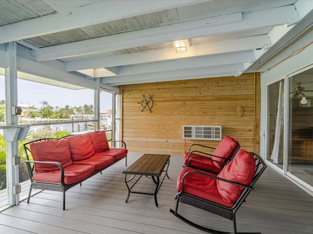 • Private Outdoor Space: Tropical landscaping with a screened in porch overlooking the canal, offering a picturesque setting for outdoor gatherings and sunset views.