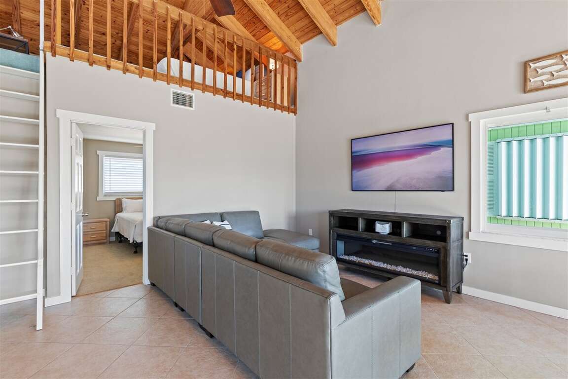 Upon entering, you step into the main living area, where a large flat-screen TV anchors a cozy, wrap-around couch, offering ample space for unwinding after a day of water adventures. Adjacent is the well-equipped kitchen, complete with updated appliances and everything needed to prepare delicious meals at your convenience.