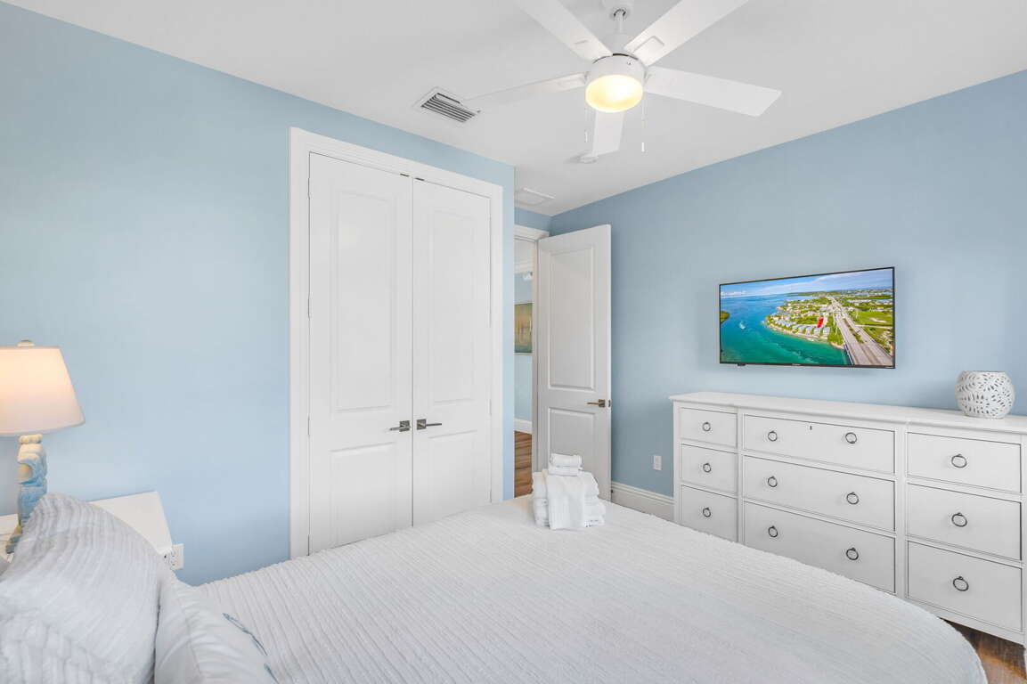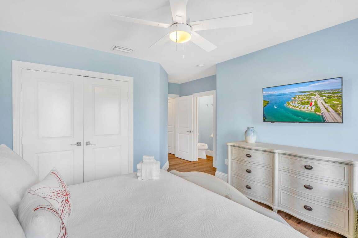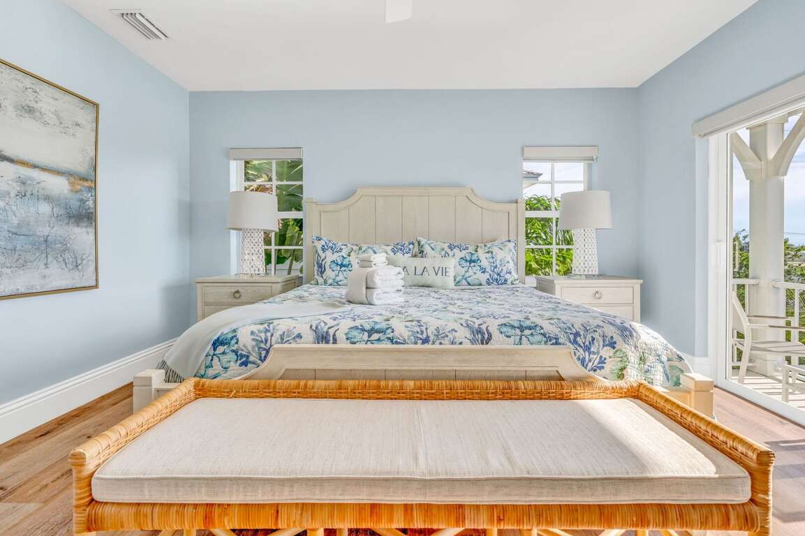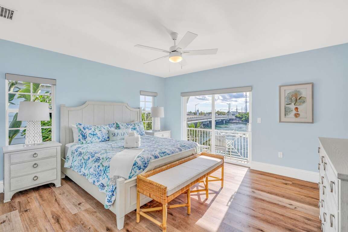 Sleep in Comfort: Master suite with walk-in closet & private balcony overlooking Vaca Cut. All bedrooms have Smart TVs and 4 of 5 bedrooms have blackout shades for restful sleep.