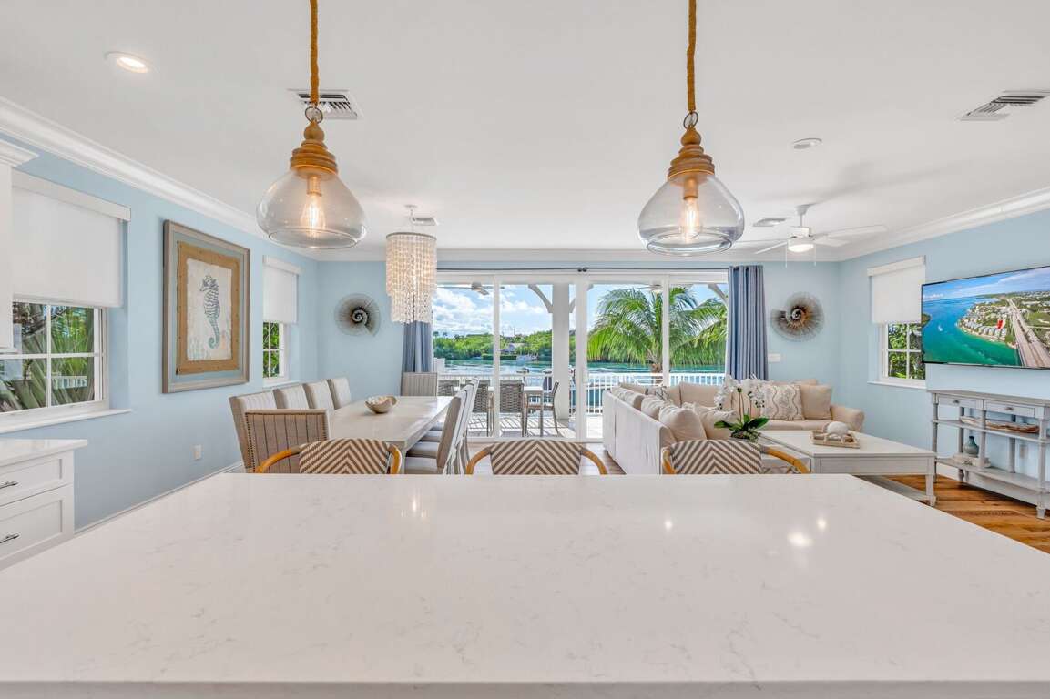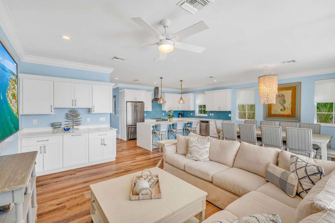 This level features a luxury open-concept kitchen, dining, and living space with panoramic water views. The gourmet kitchen includes an island with seating for three, full stock of essentials, and high-end appliances for easy meal prep. The dining area comfortably seats 10 with stunning ocean and Gulf views. The spacious living room features a large Smart TV and plush sofa seating for relaxing after a day on the water. Also on this floor is Bedroom 3 (Queen) with blackout shades, Smart TV, dresser, and closet, plus a full hall bathroom with shower.