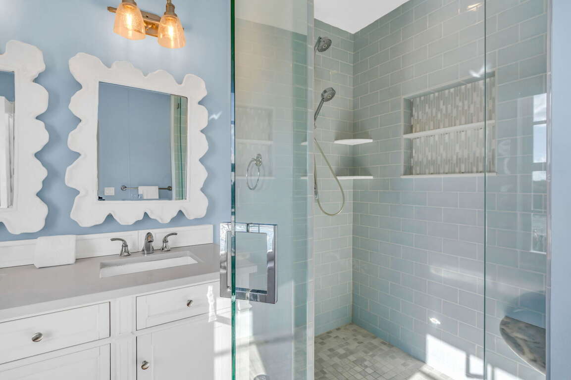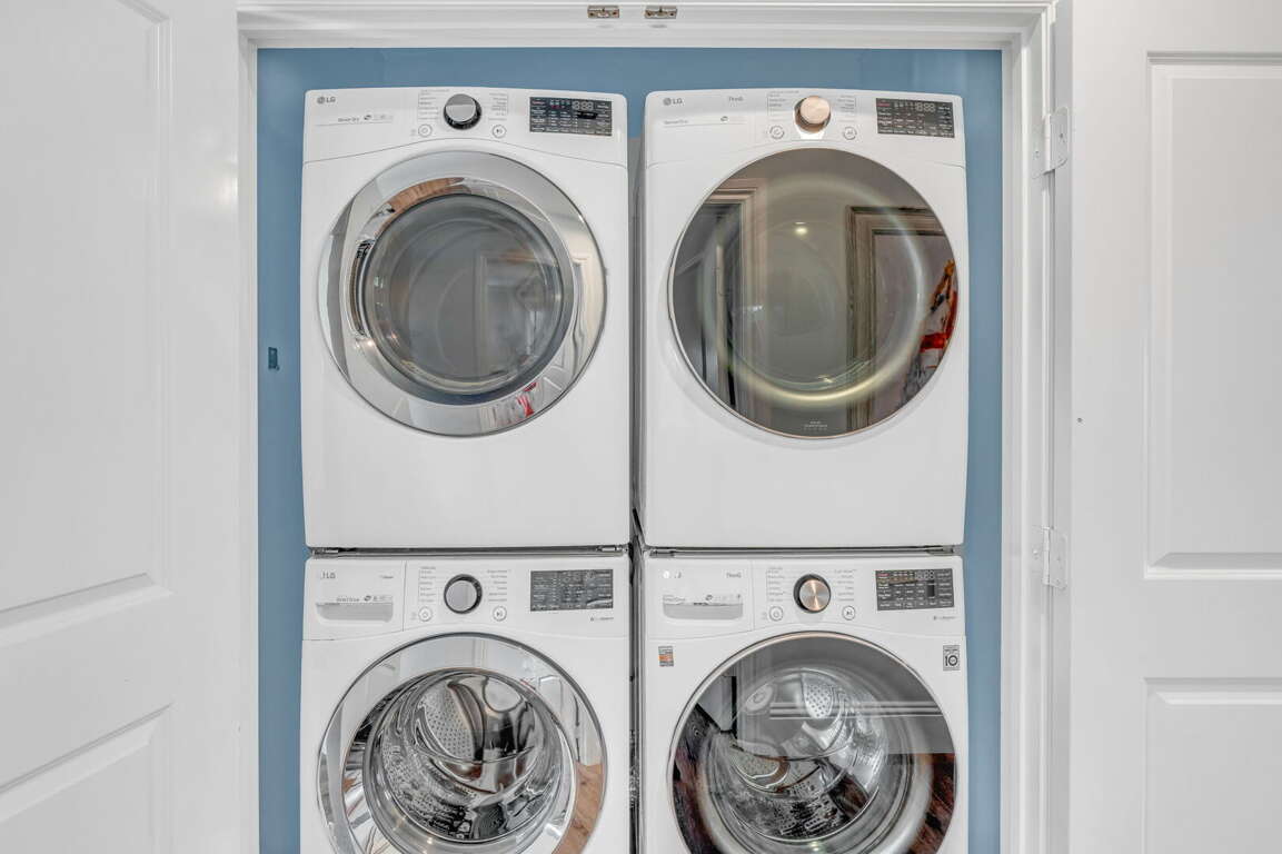 Retreat upstairs to your private sanctuary. The Master Suite boasts a king bed, walk-in closet, blackout shade, Smart TV, and private balcony with seating overlooking the sparkling waters of Vaca Cut. Its ensuite bathroom includes a dual vanity and oversized walk-in shower. Bedroom 2 also offers a king bed, ensuite bath with shower, dresser, closet, blackout shades, and Smart TV. Bedroom 4 has a Queen bed with Smart TV, dresser, and blackout shade, while Bedroom 5 features a twin-over-twin bunk with a pull-out twin trundle, Smart TV, and closet. These bedrooms share a hall bath with dual vanity and shower/tub combo. For added convenience, dual sets of washers and dryers are available on-site.