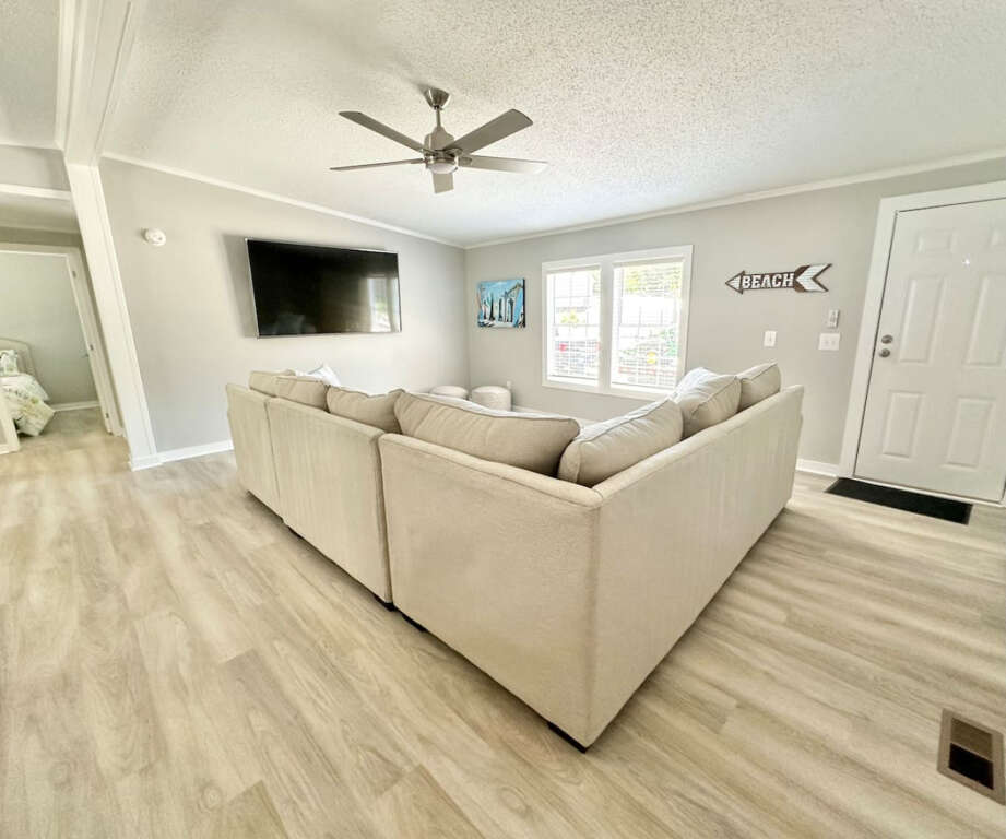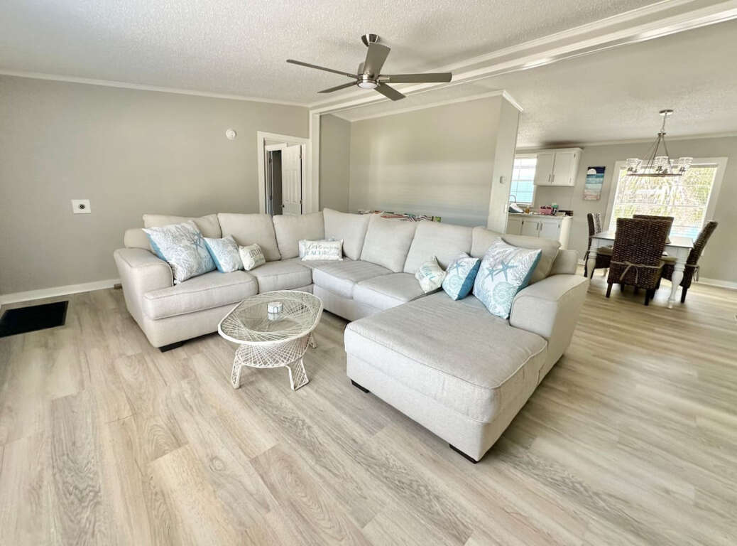 Step inside to discover a warm and inviting living area, perfect for unwinding after a day of adventuring the Crystal Coast. The open floor plan creates a seamless flow between the living room, dining area, and kitchen, making it an ideal space for socializing and creating lasting memories.