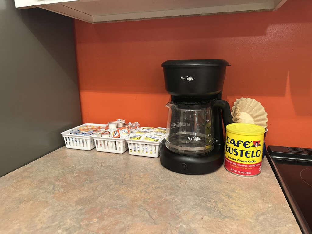 - Drip coffee maker, complimentary coffee grounds, assorted creamers, sugar and artificial sweetner