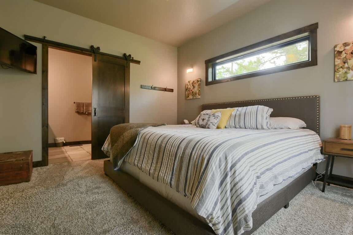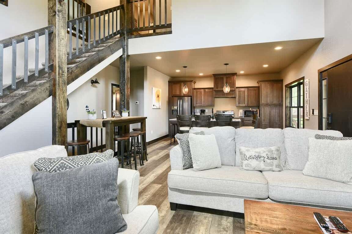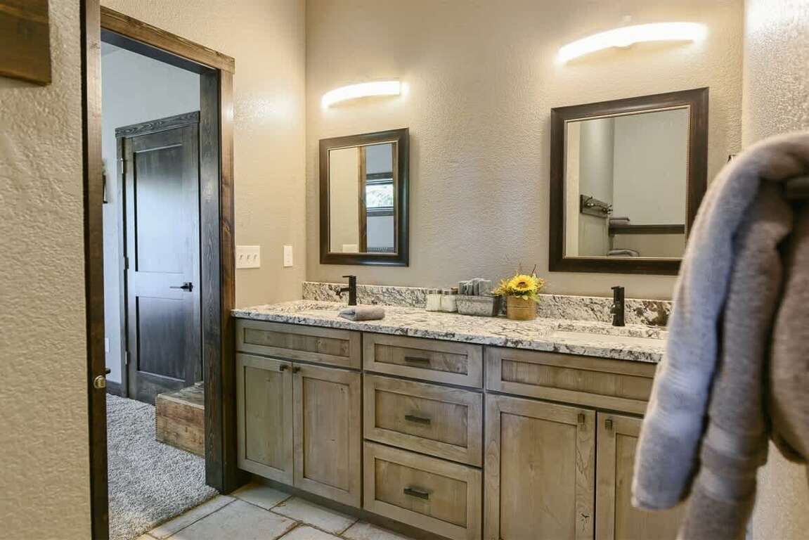 Immerse yourself in the luxurious charm of Iron Wood Lodge, a stunning Black Hills vacation rental boasting 5 bedrooms, 3.5 baths, a spacious deck, and breathtaking mountain vistas. The modern rustic design of the lodge perfectly complements the natural beauty of its surroundings, creating an atmosphere of elegance and comfort. The spacious deck offers panoramic mountain views, providing the ideal setting for relaxing mornings and enchanting evenings. Inside, the lodge exudes a sense of warmth and sophistication, with ample room for large groups to gather and unwind. Whether enjoying the cozy fireplace in the family room or savoring a meal in the well-equipped kitchen, guests will appreciate the thoughtful design and attention to detail that make Iron Wood Lodge a truly exceptional retreat.