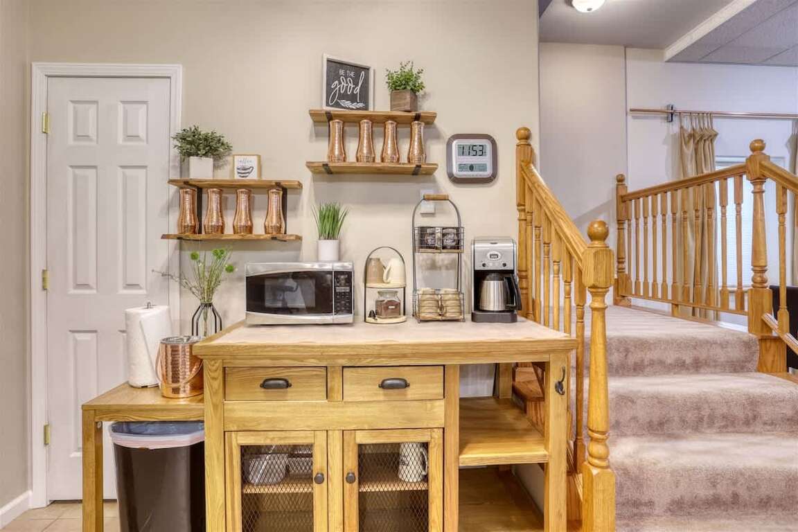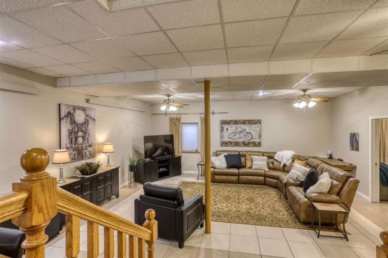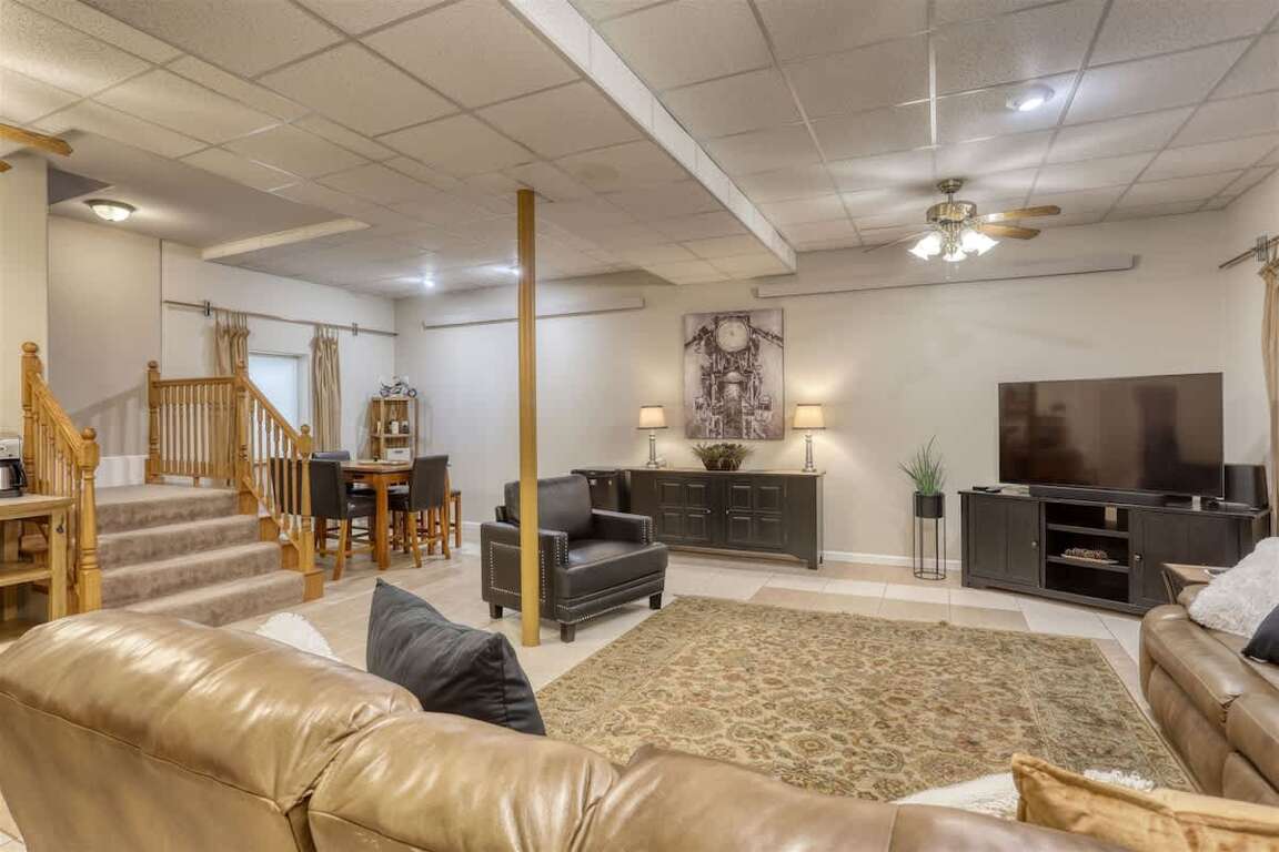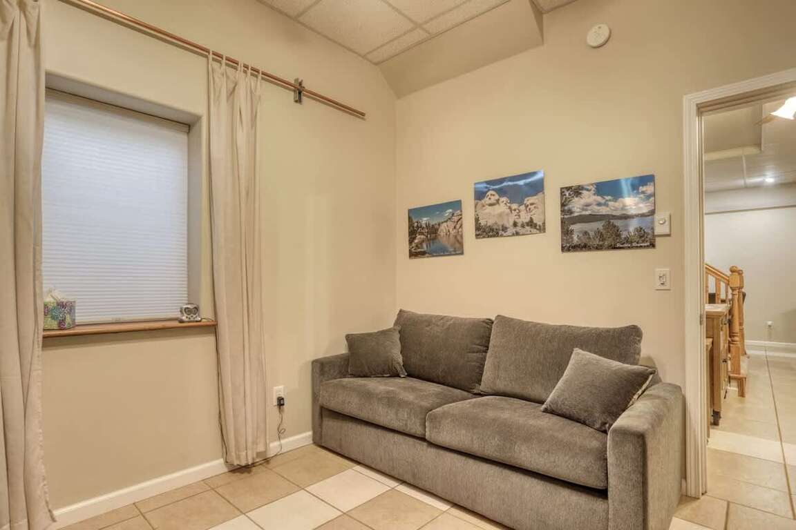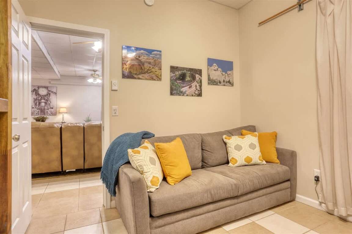 The interior of this 5-bedroom short term rental in Sturgis SD boasts a spacious open floor plan on the main level, providing a welcoming and comfortable living environment for guests. The room layout includes three bedrooms and two bathrooms on the main level, ensuring convenience and privacy. The design elements feature a well-thought-out arrangement of furniture, creating a harmonious flow throughout the space. Downstairs, guests can enjoy a family room equipped with various entertainment options, adding to the overall appeal of the property. With sleeping arrangements for up to 12 individuals, the bedrooms and baths are strategically spread out, offering everyone their own space while still fostering a sense of togetherness.