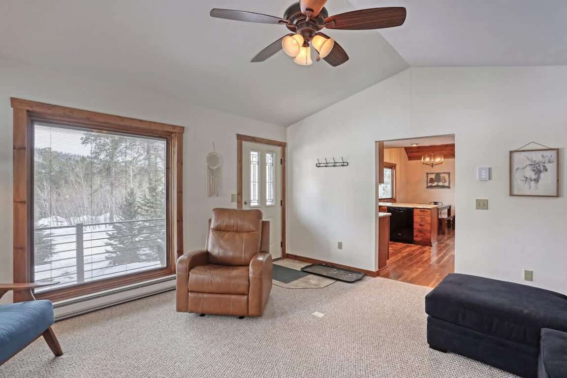Boasting a prime location half a mile from the main lodge, the Terry Peak South Dakota vacation cabin offers breathtaking views and a range of amenities for a relaxing getaway. The property features a spacious wrap-around deck, ideal for enjoying the beautiful scenery, and an outdoor 7-man hot tub perfect for unwinding under the stars. Inside, the cabin showcases a newly remodeled kitchen-dining area with ample seating, providing a cozy space for meals with family and friends. The well-equipped kitchen caters to all culinary needs, while the spacious living area with a gas fireplace and smart TV offers comfort and entertainment. The interior design seamlessly combines modern convenience with a rustic charm, creating a welcoming atmosphere for guests seeking a mountain retreat.