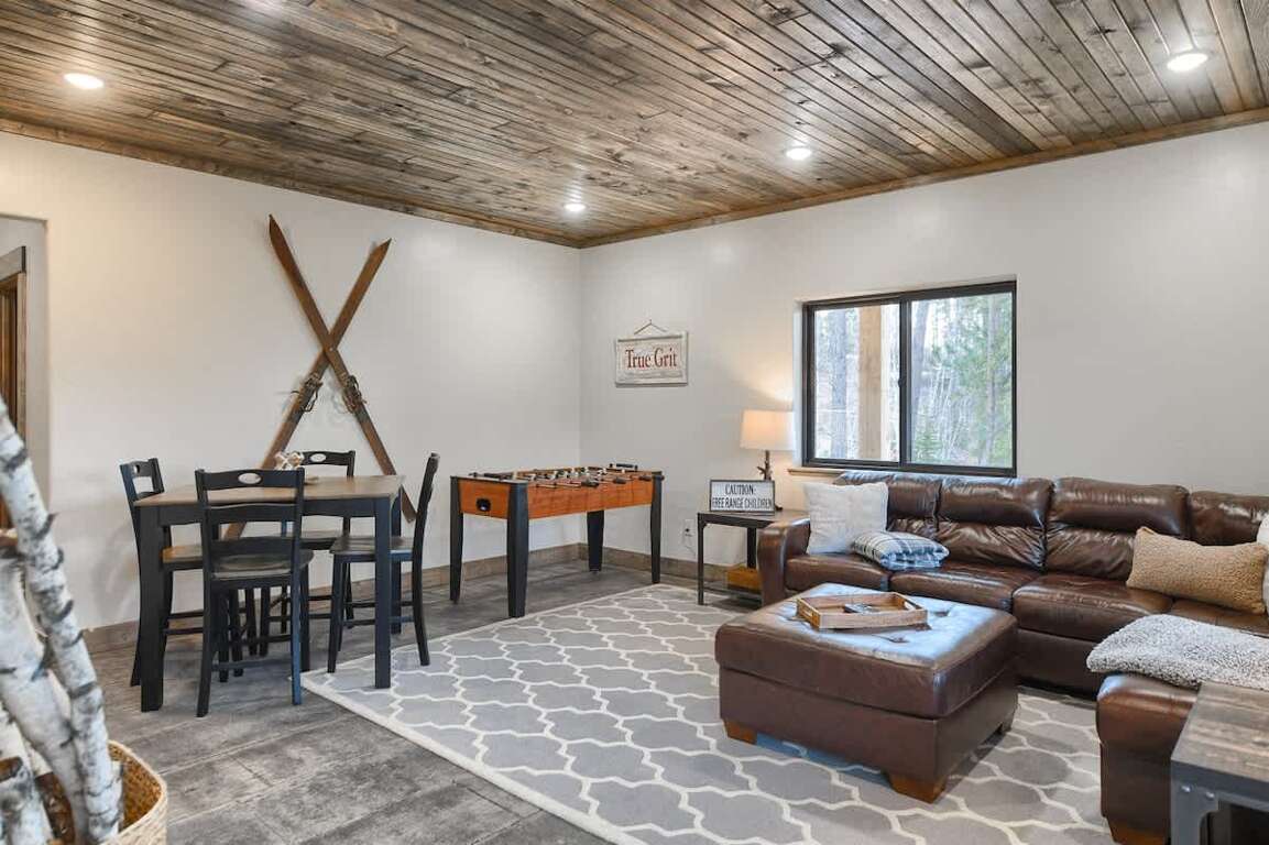 - Ideal for relaxation, with heated floor living space, foosball table, and TV in the lower level