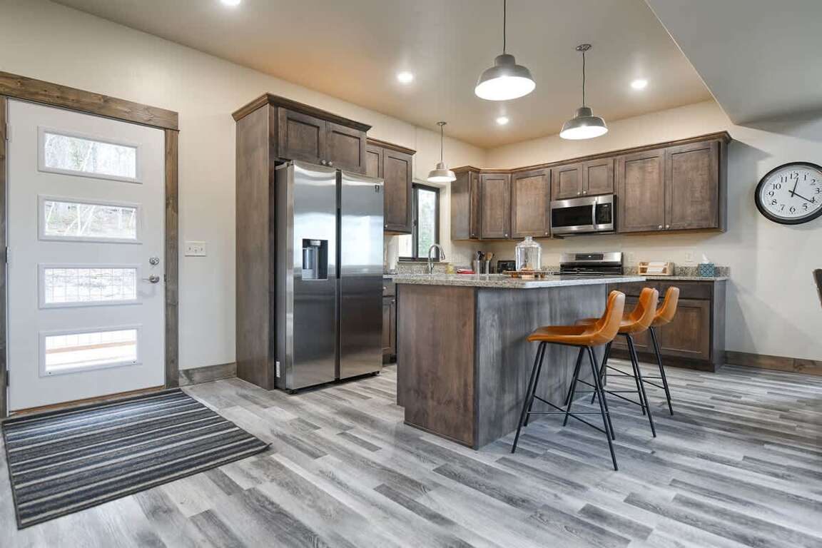 Featuring three distinct levels, the property layout of Hickok's Bluff showcases a seamless blend of comfortable living spaces and thoughtful amenities for a memorable vacation experience in Lead, SD. The main level offers a spacious living area, a fully equipped kitchen, a dining area, and a luxurious master suite with a king bed and full bath. Upstairs, guests will find additional living space, bunks in the hallway, and three bedrooms - two with king beds and one with a queen bed - along with two full bathrooms. The lower level boasts a heated floor living space with entertainment options like a foosball table and TV, as well as two bedrooms with queen beds and bunk beds. Outside, enjoy the wrap-around deck with seating, gas grill, covered patio with a hot tub, and ample parking options, including a 2-stall garage.