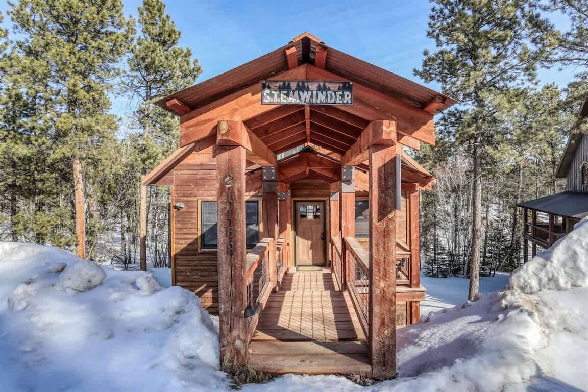 Located in the scenic Gilded Mountain area, Stem Winder Lodge is a charming 4-bedroom retreat offering a perfect blend of comfort and convenience. The interior design of the lodge is cozy and inviting, with a spacious open floor plan that includes a full kitchen, gas fireplace, and a covered back deck with a serene forest view. Situated on paved roads just 10 minutes from Deadwood, guests can easily access nearby attractions such as the Terry Peak Ski Area, snowmobile and ATV trails. Additionally, being across the street from the Gilded Mountain Clubhouse provides access to outdoor amenities like an heated pool, sauna, and game room, ensuring a delightful stay for all.
