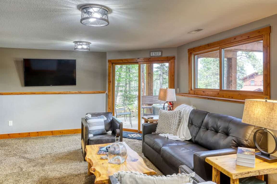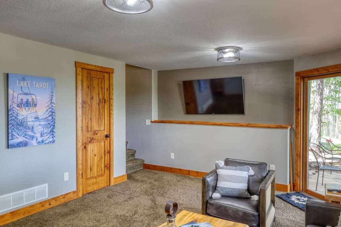 Second Living Space: At the bottom of the stairs you will find a second living space that features comfortable seating, large wall mounted TV, and a foosball table for some game-time. The glass doors lead to an outside patio with seating and a fire table.