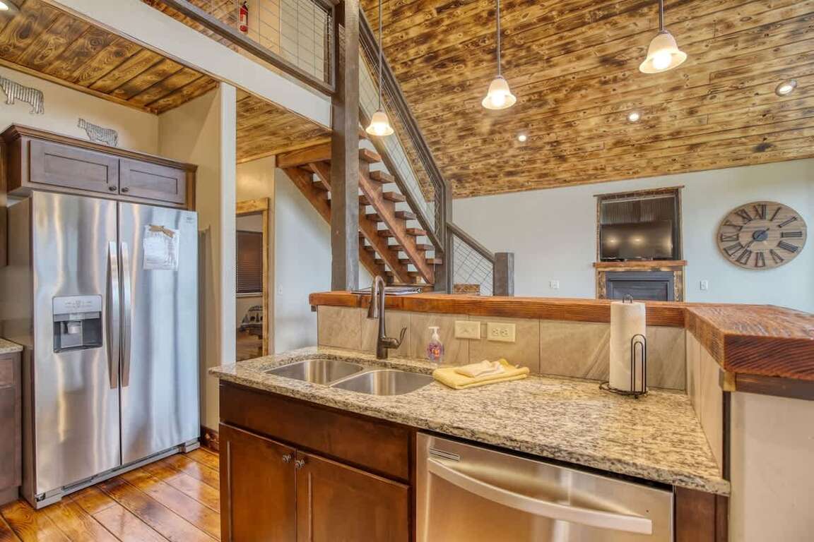 ■ Open-Concept Living Space: A bright and spacious main area featuring a fully equipped kitchen with microwave, dishwasher, and breakfast bar seating for 3. The dining table seats 4, and the living room boasts a cozy gas fireplace, vaulted wood ceilings, large picture windows, and plenty of comfortable seating with two couches and a recliner—perfect for relaxing after a day of exploring.