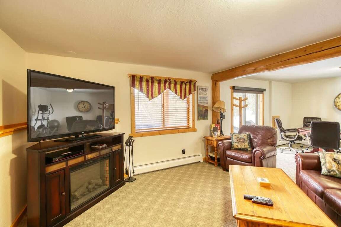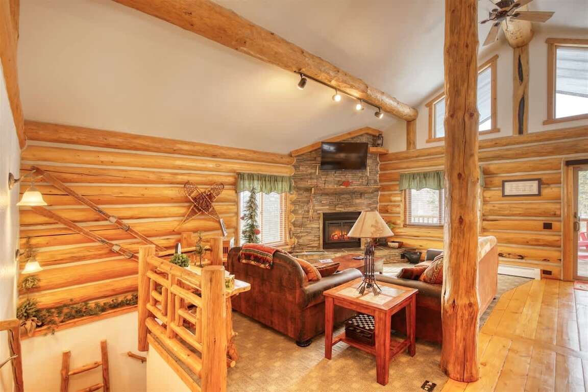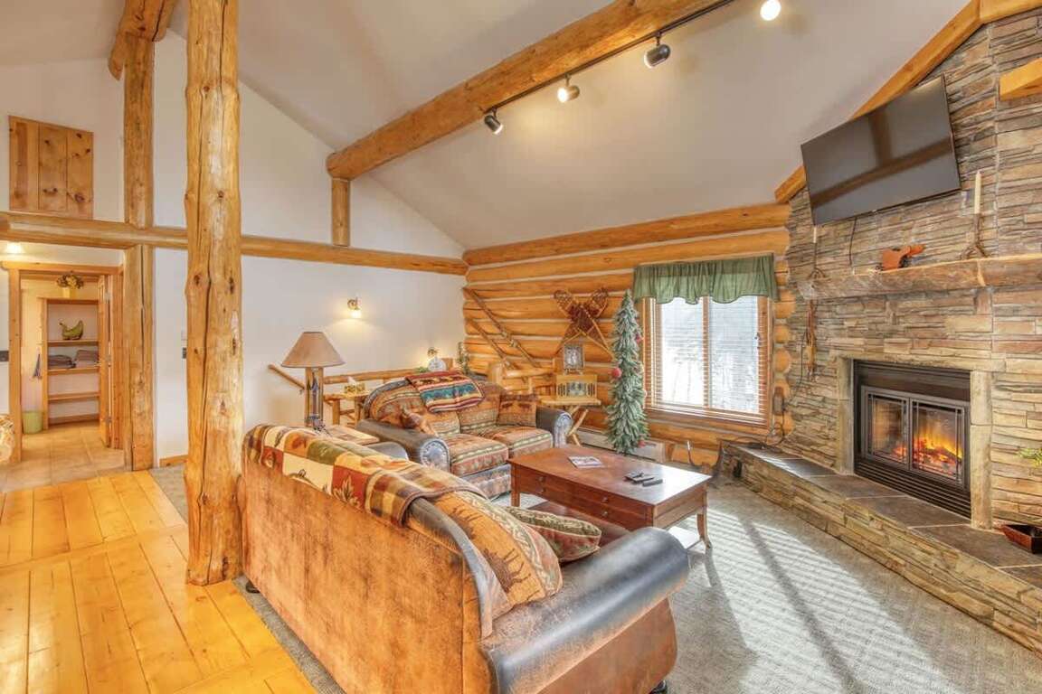 ■ Open Concept Living Space: Cozy living room with gas fireplace, satellite TV with DVD player, and plenty of seating for relaxation.