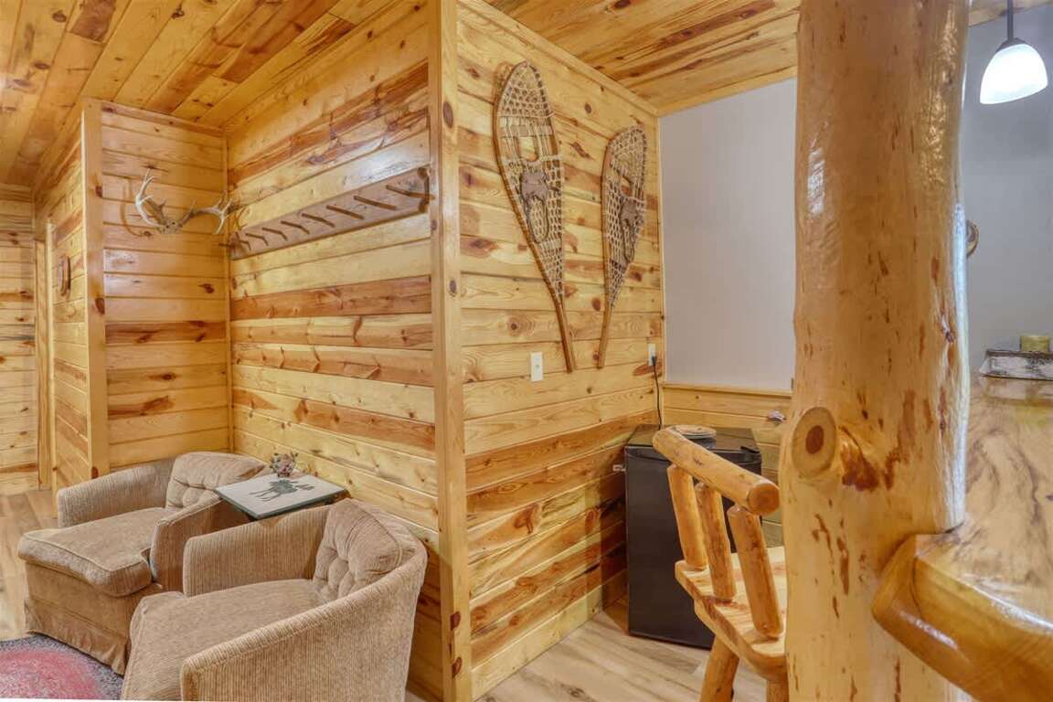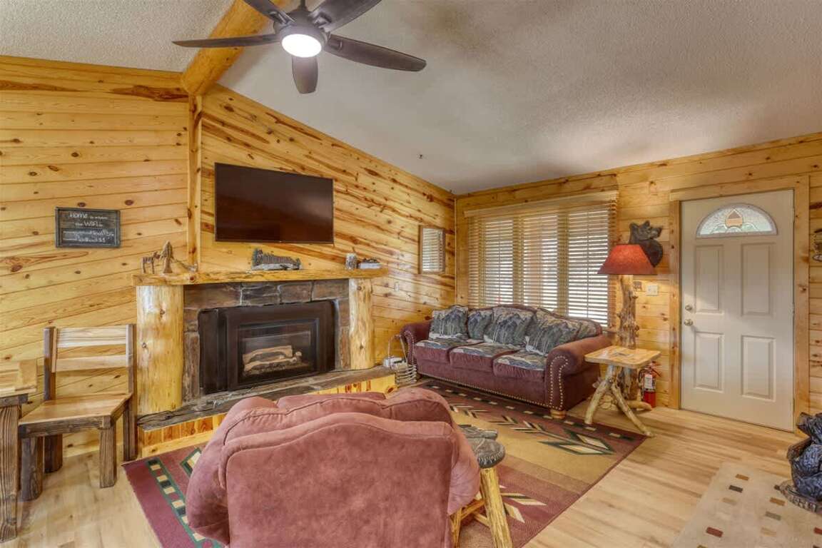 ■ Living Area: Cozy gathering space with gas fireplace, log furniture, and plenty of seating.