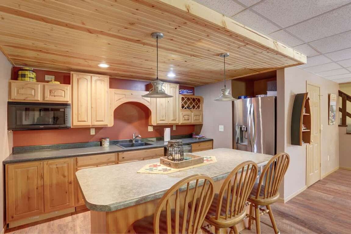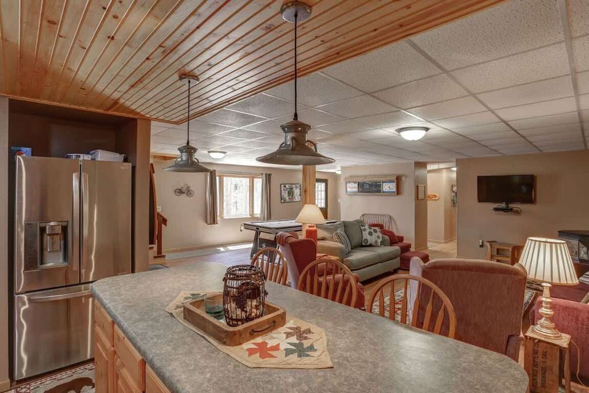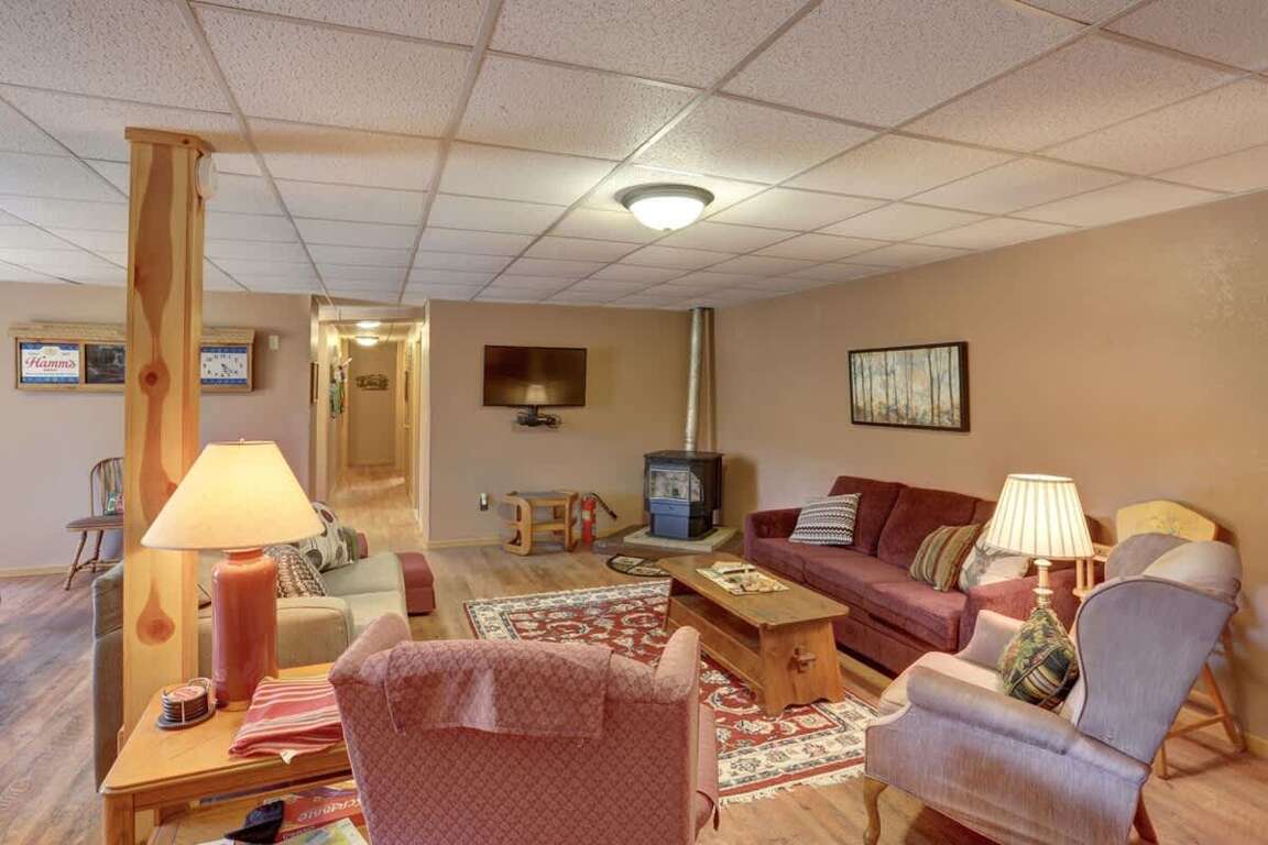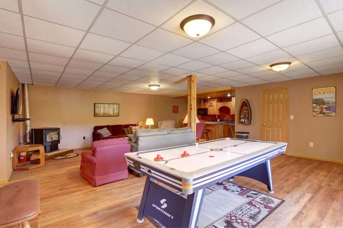 The lower level offers a cozy space to relax, watch TV, or enjoy a family fun night. Features include a pellet stove, sofa sleeper, large TV, and bar area with a microwave, refrigerator, and 3 bar stools. A foosball table adds even more entertainment.