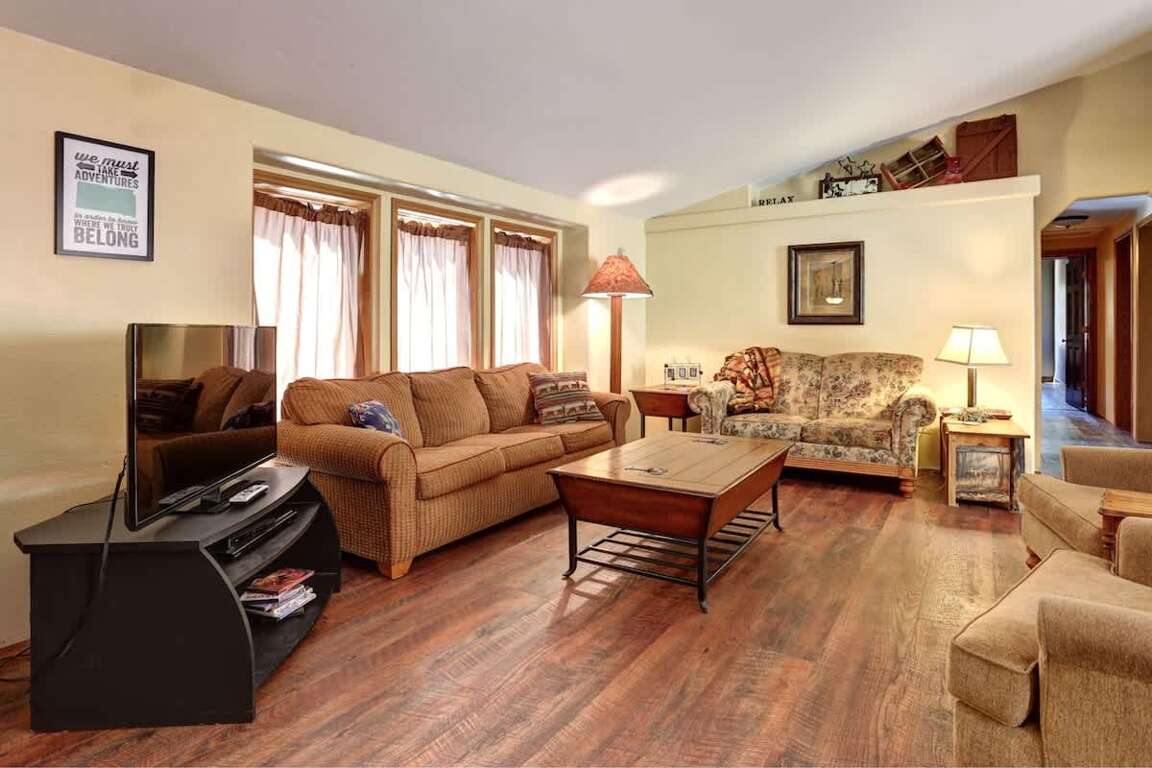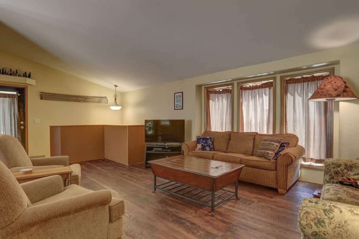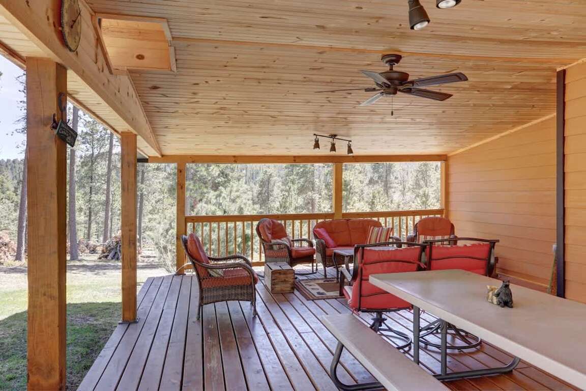 When you’re ready to unwind from your Black Hills adventures, gather in the cozy living area with a large flat-screen TV and a sofa sleeper. The open-concept dining and living areas create a warm, social atmosphere with direct access to the large back deck.