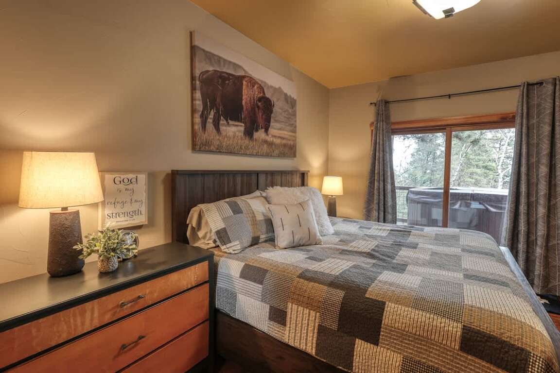 Located in the serene beauty of the Black Hills National Forest, this luxurious Lonestar Lodge features 5 bedrooms, a loft, and a bonus room above the garage, providing an ideal retreat for group getaways. The property offers versatile bedroom configurations to accommodate various sleeping preferences, including a King bedroom on the main level, a Queen bedroom, and a bedroom with twin-size bunk beds on the lower level. The upper level boasts a Queen bedroom, along with an open loft featuring a full bed. Additionally, the bonus room above the garage provides extra sleeping space with a trundle bed comprising two twin beds. Outdoor spaces include wrap-around decks with a gas BBQ grill, perfect for al fresco dining and relaxation amidst the natural beauty.