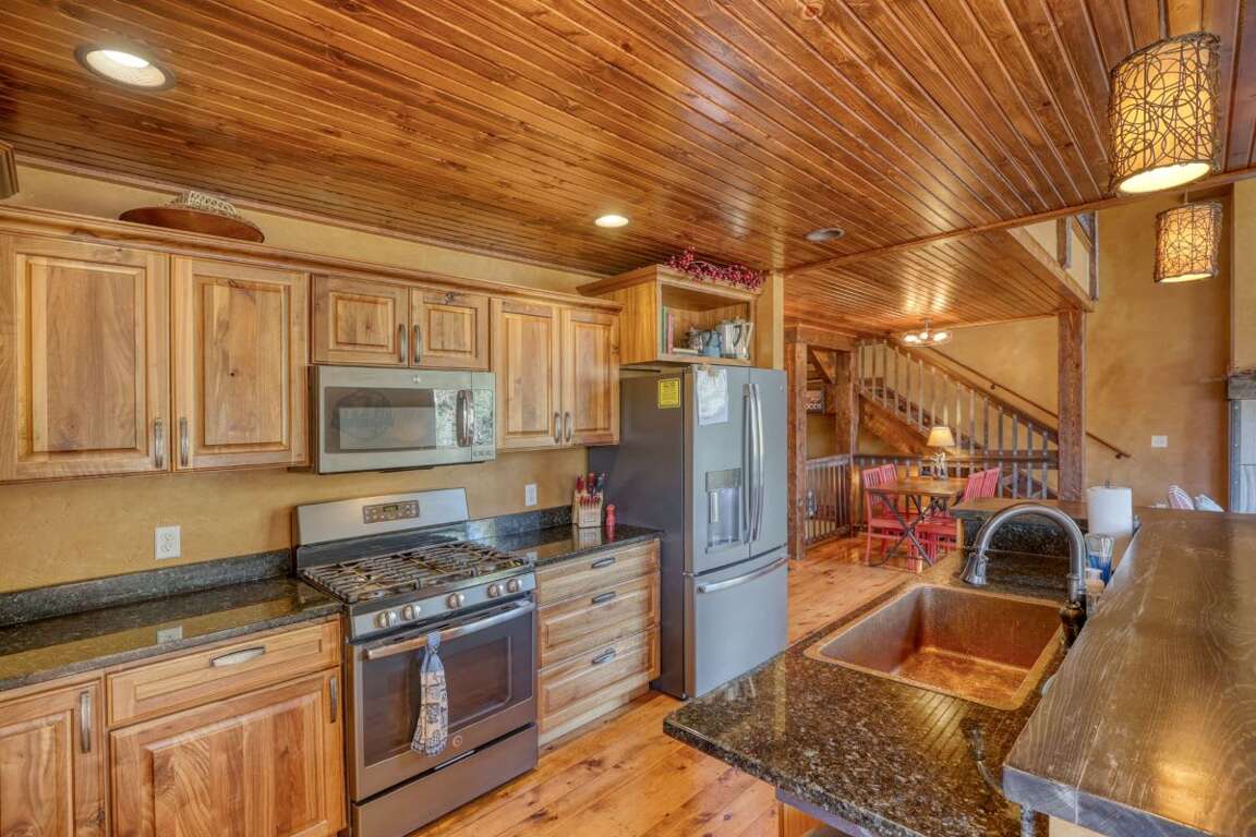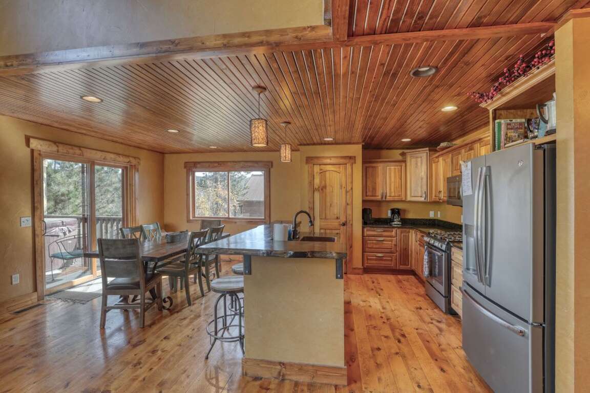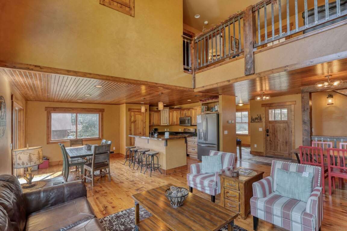 The luxurious 4-bedroom Leaning Tree Lodge in Gilded Mountain, South Dakota offers a spacious retreat that accommodates up to 10 guests with 2 full bathrooms, 1 half bathroom, and a total living space of 2368 sqft. The interior design of the cabin is a harmonious blend of modern elegance and rustic charm, featuring custom furnishings and beautiful decor throughout. Each bedroom boasts comfortable bedding, with three king beds, one queen bed, and a bunk bed for versatile sleeping arrangements. Outside, guests can enjoy a range of outdoor amenities, including a private hot tub for relaxation under the stars and a gas BBQ grill for alfresco dining. Whether lounging indoors or exploring the surrounding natural beauty, Leaning Tree Lodge provides the perfect backdrop for a memorable vacation.