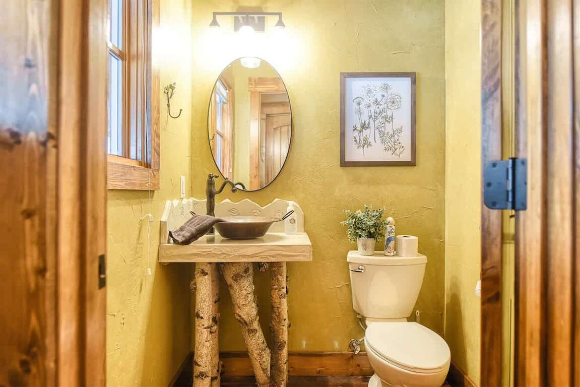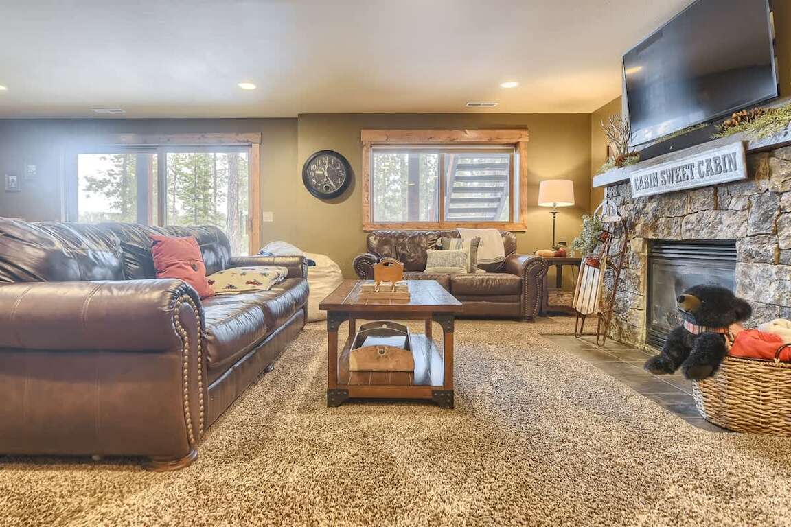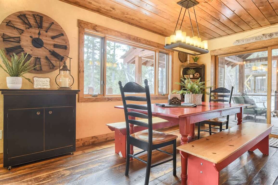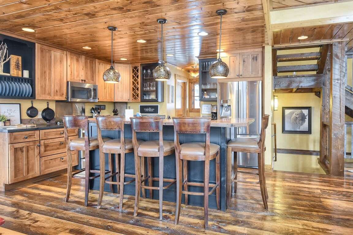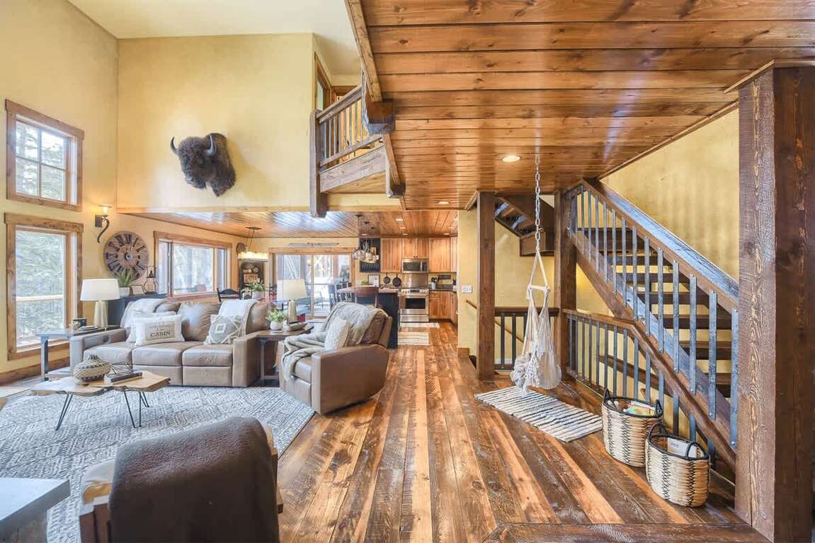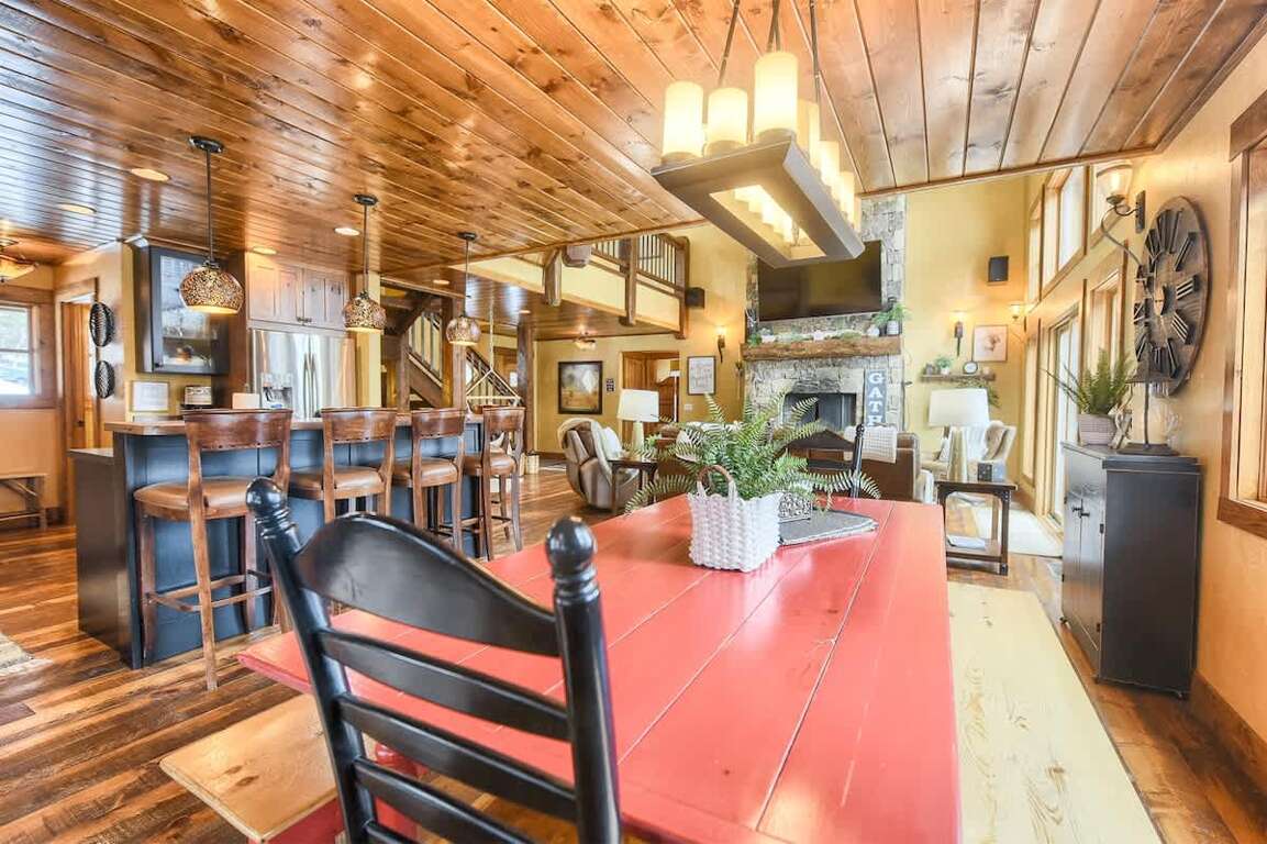 Open Concept Living Space: The main floor features a fully equipped kitchen with a gas stove—ideal for preparing family meals. The living room includes plenty of comfortable seating, a wood-burning fireplace, flat-screen TV, and large picture windows to take in the breathtaking scenery. Relax in the indoor hammock and dive into a good book. For meals, enjoy a dining table with seating for 8 and 5 stools at the breakfast bar.