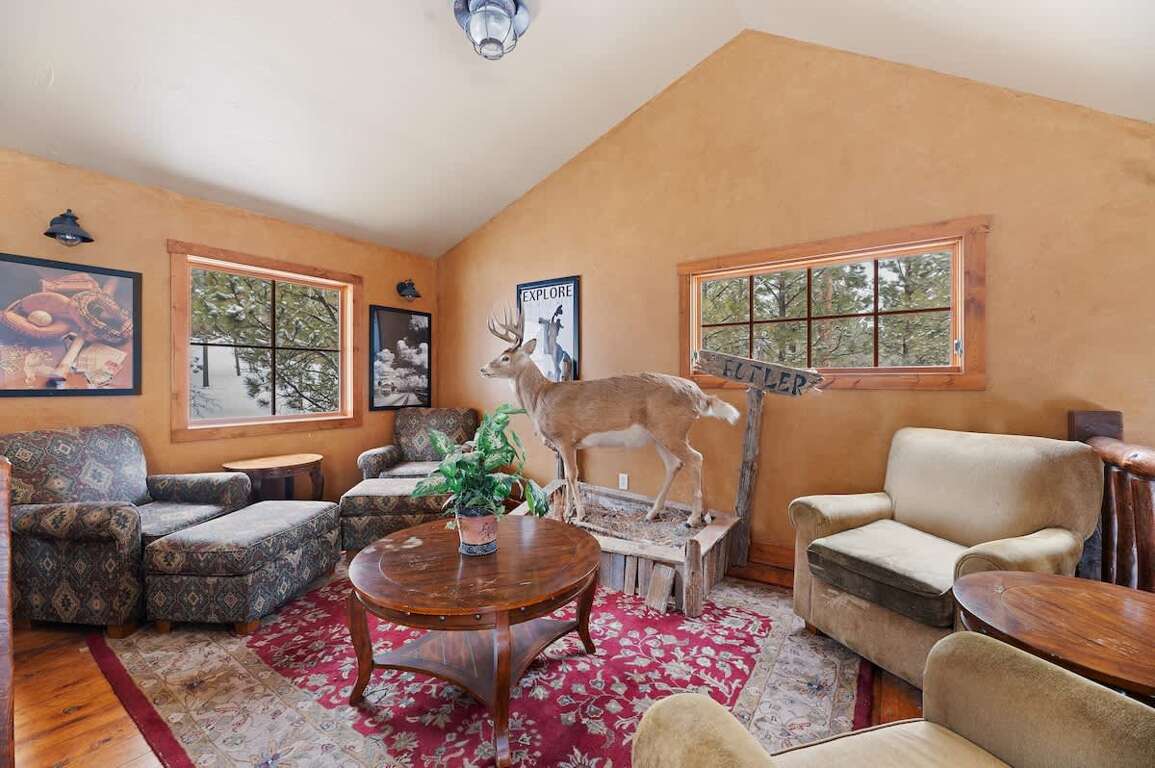Located in the desirable Gilded Mountain Community near Deadwood, South Dakota, this spacious 5-bedroom, 3.5-bath cabin is the ideal retreat for families and groups of all sizes. The large wraparound covered deck spans three sides of the home, offering stunning views of the Black Hills. With a gas BBQ grill and a cozy outdoor wood-burning fireplace, it’s the perfect place to relax, entertain, watch for wildlife, or enjoy your morning coffee. Just outside the lower-level patio doors, you’ll find a hot tub—perfect for a long soak after a day of skiing, hiking, or exploring.