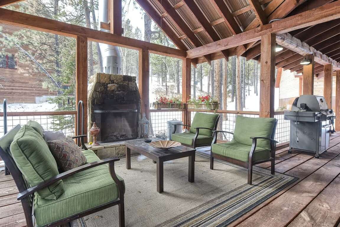 Outdoor Living Space: Step out onto the expansive deck from multiple access points. It features a gas grill, outdoor wood-burning fireplace, and ample seating—perfect for enjoying mountain views in every season.