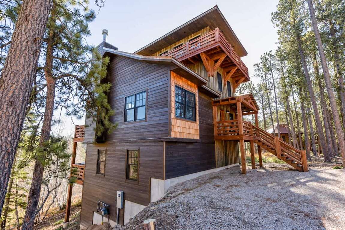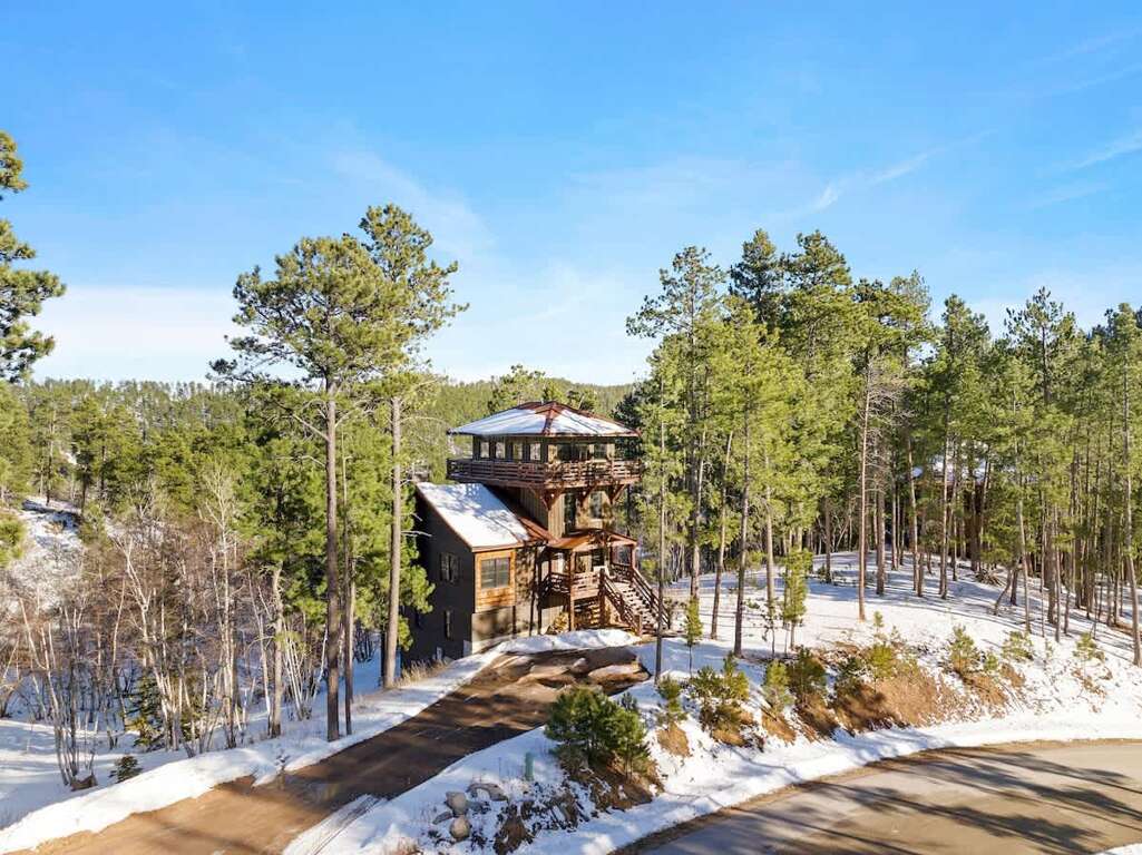 Escape to the exquisite Lookout Tower Cabin, a 5-bedroom retreat in the scenic Gilded Mountain Development. With custom design elements and cozy gas fireplace, this luxurious getaway sleeps up to 12 guests across four levels. Rates range from $225 to $650 per night, varying by season. Enjoy the private hot tub, game room, and modern kitchen, perfect for family reunions or serene relaxation retreats. Contact Deadwood Connections for booking and more information on this deluxe mountain sanctuary. Discover the deluxe comforts and stunning views awaiting at Lookout Tower Cabin.