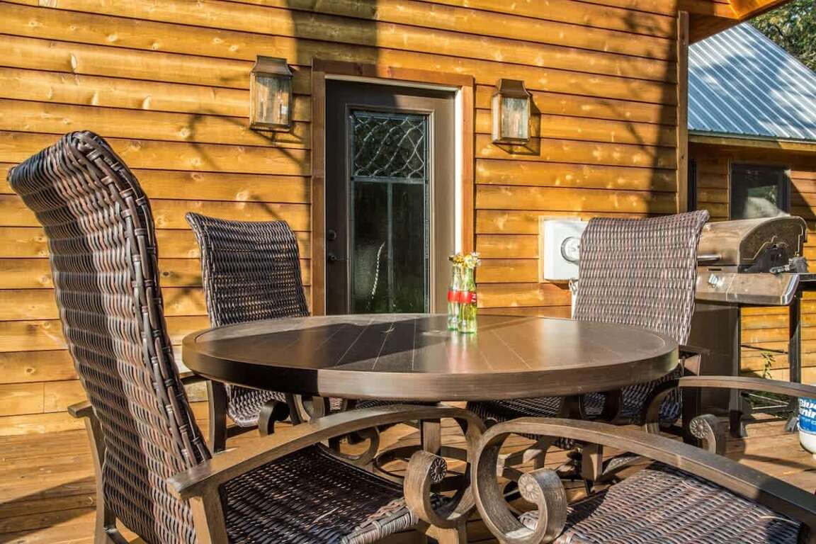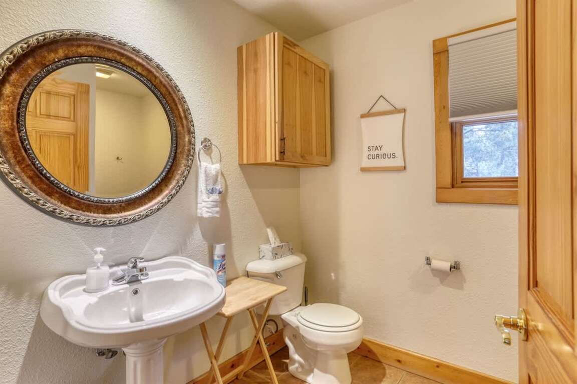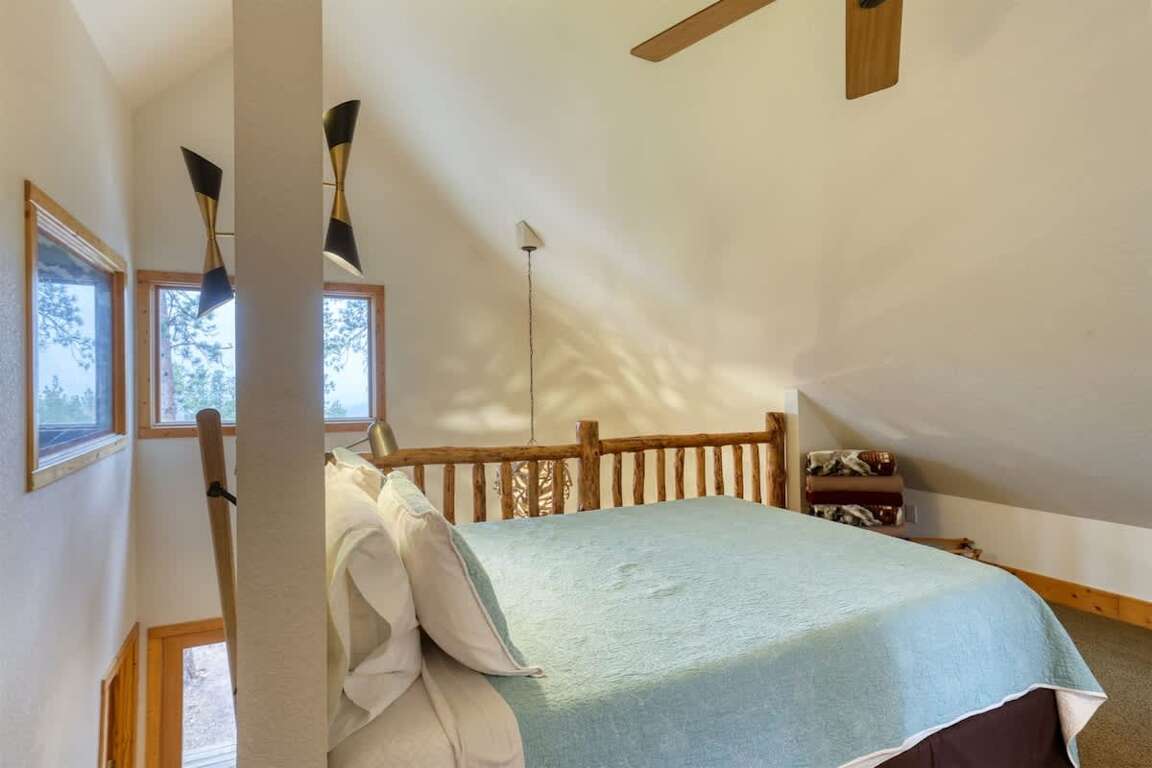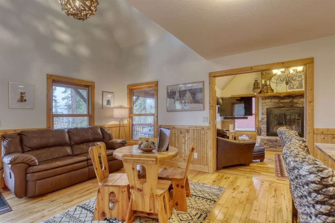 What features does the Buffalo Trail cabin in Terry Peak, South Dakota offer to accommodate up to 12 guests? This charming cabin boasts 4 bedrooms, 2 full bathrooms, and cozy accommodations suitable for families or groups seeking a mountain retreat. The property features a well-equipped open kitchen, dining area, and sitting space on the main level, complete with a wood fireplace for chilly evenings. Upstairs, guests will find an additional bedroom, an open loft, a full bathroom, and a convenient laundry room. Outside, two large deck areas provide stunning views of the surrounding Black Hills, making it an ideal spot to unwind after a day of exploring nearby attractions such as hiking trails, ski slopes, and the vibrant town of Deadwood.