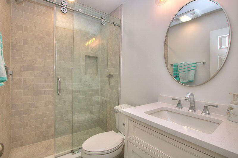 Bedrooms include the master suite with king bed, private balcony with Sound views, TV, and updated bathroom with walk-in shower, 2 vanities and walk-in closet. A guest bedroom with 2 double beds features a TV and full bath with walk-in shower, and the third bedroom with queen bed features a TV and half bath, which doubles as a Powder Room for the common areas of the villa. There is also a utility room with washer and dryer, and cleaning supplies (vacuum, mop, broom), if needed.