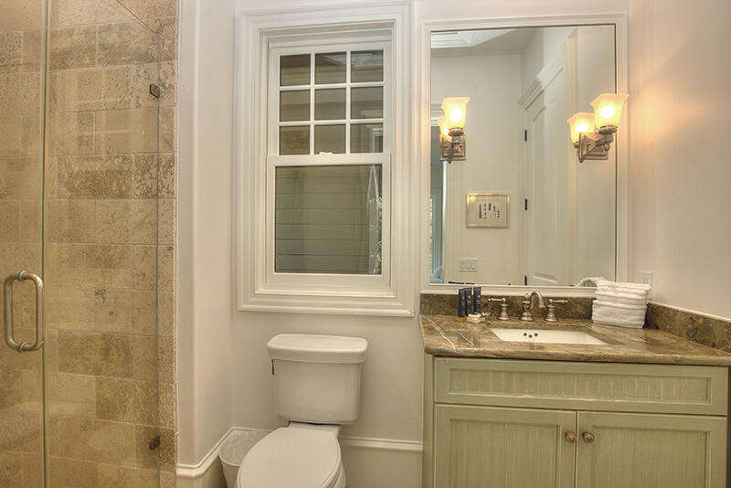 Bedrooms include a Primary Suite on the first floor with King bed and separate His and Her baths with walk-thru shower. This Suite includes a private den with sofas, desk and TV, which serves as a quiet place to read, relax or work remotely. The second floor features 4 guest suites, including 3 suites with king beds and full baths and a bunk bedroom with 2 sets of twin over twin bunk beds and two twin trundle beds. The home also features a guest house with 2 private bedrooms and full baths, one with a King bed and the other with a pair of bunk beds. All bedrooms include large closets and flat screen TVs, and free wireless internet is available throughout the home.