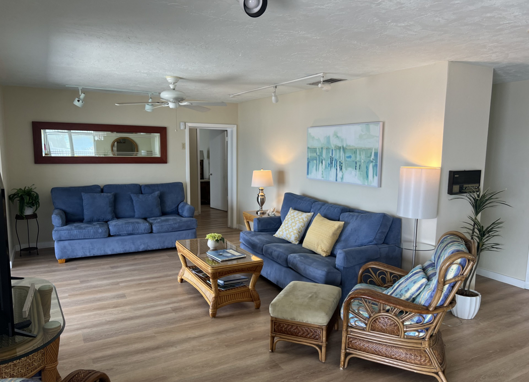 - Living Area: Comfortable seating, flat-screen TV, and large sliding doors that open to the deck, bringing in natural light. Enjoy endless water views from your living and dining areas.