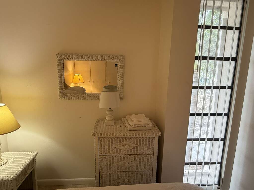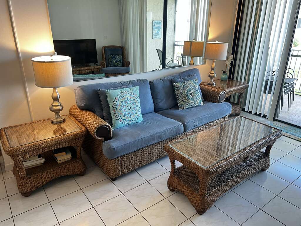 -Bright Living Area: The living room is designed with comfort in mind, featuring wicker furniture, plush seating, and tasteful island-themed artwork. The open layout ensures a seamless flow between the living and dining areas.