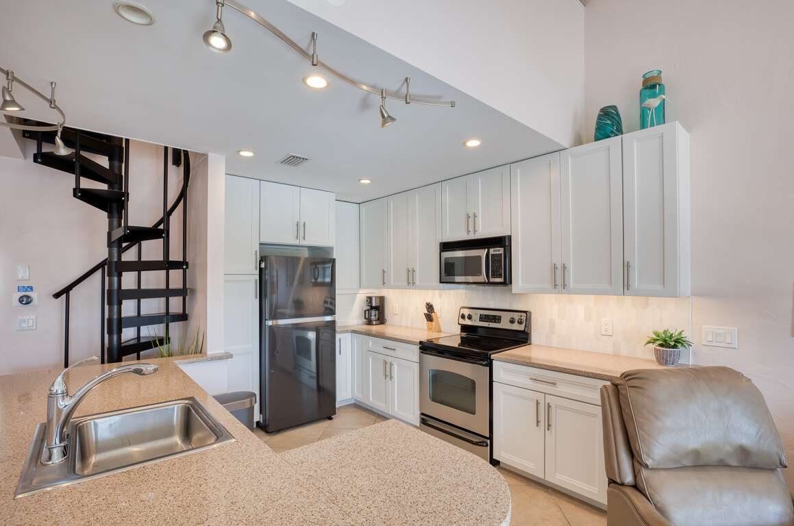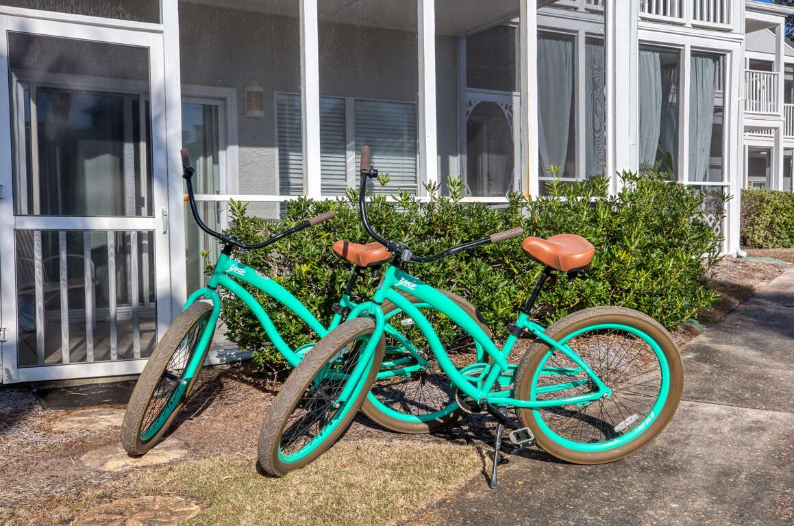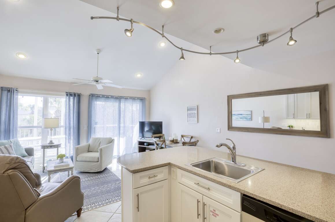 What essential services are provided with the charming vacation condo in Santa Rosa Beach, Florida? The Palms North 4B condo offers a range of services to guarantee your stay is enjoyable. Enjoy beach service, including chairs and umbrellas available seasonally for your relaxation by the ocean. Take advantage of the pool recreation facilities with loungers and umbrellas for your comfort while soaking up the sun. Additionally, engage in some friendly competition on the shuffleboard court or explore the area with the provided bicycles. The fully stocked kitchen with a large island seating six assures you have everything you need for dining in. For entertainment, smart TVs in the bedrooms, a reading area, and streaming services are available for your enjoyment.