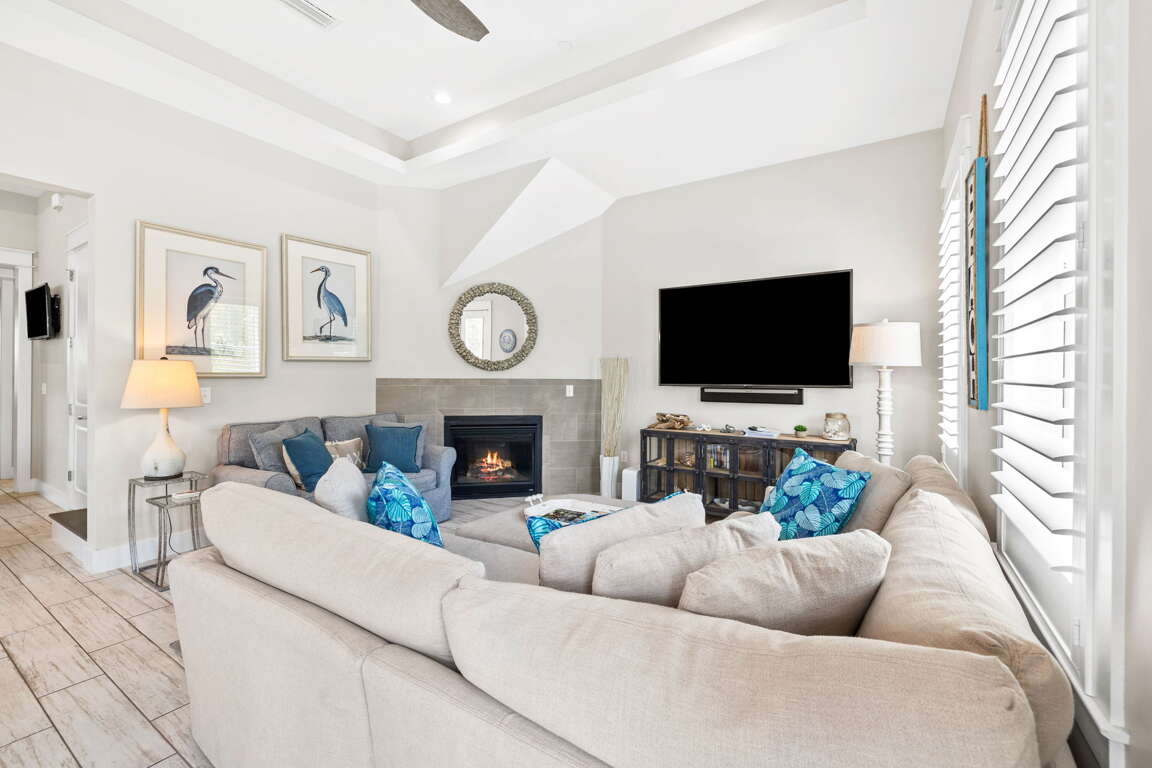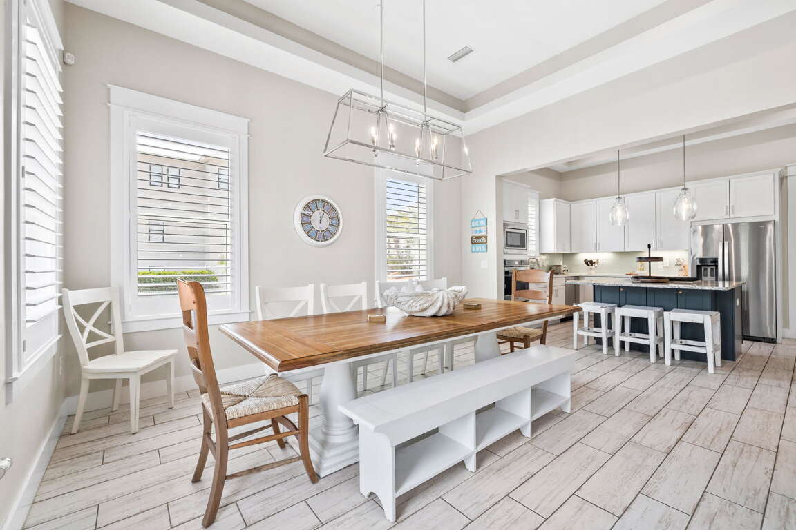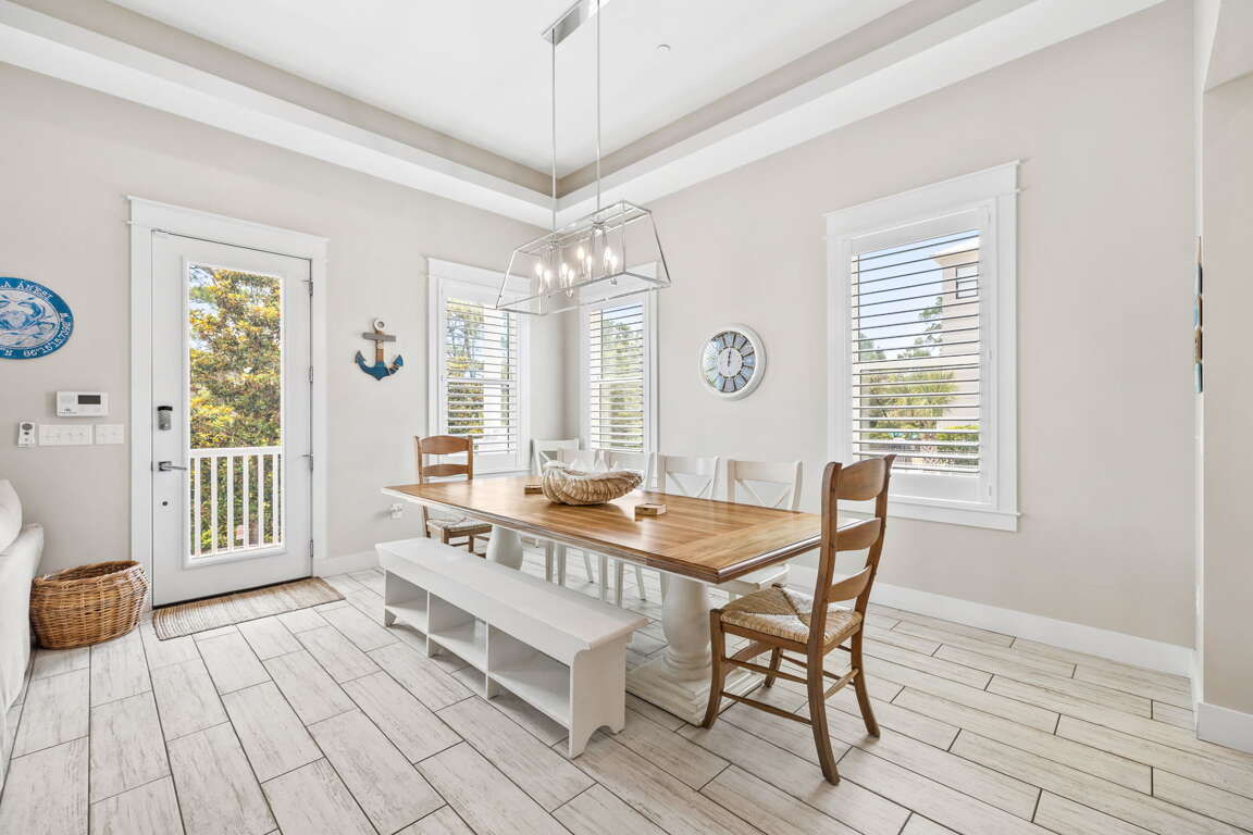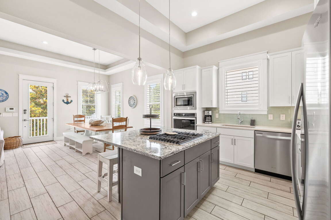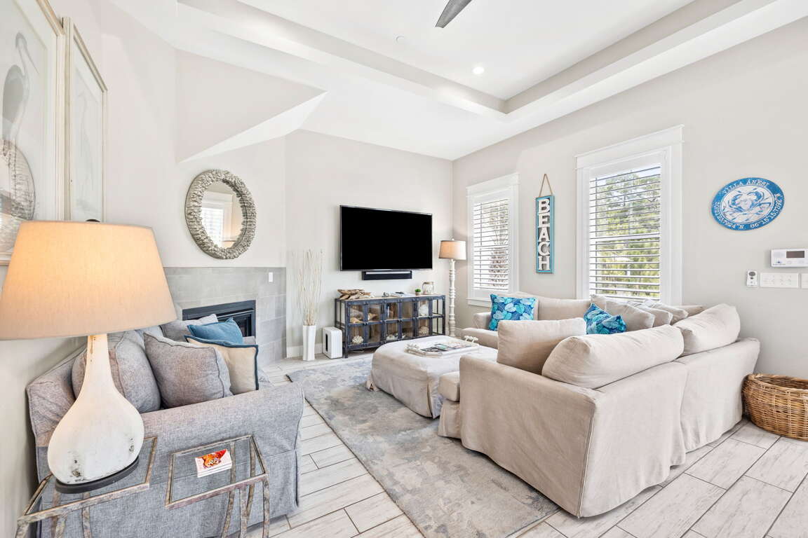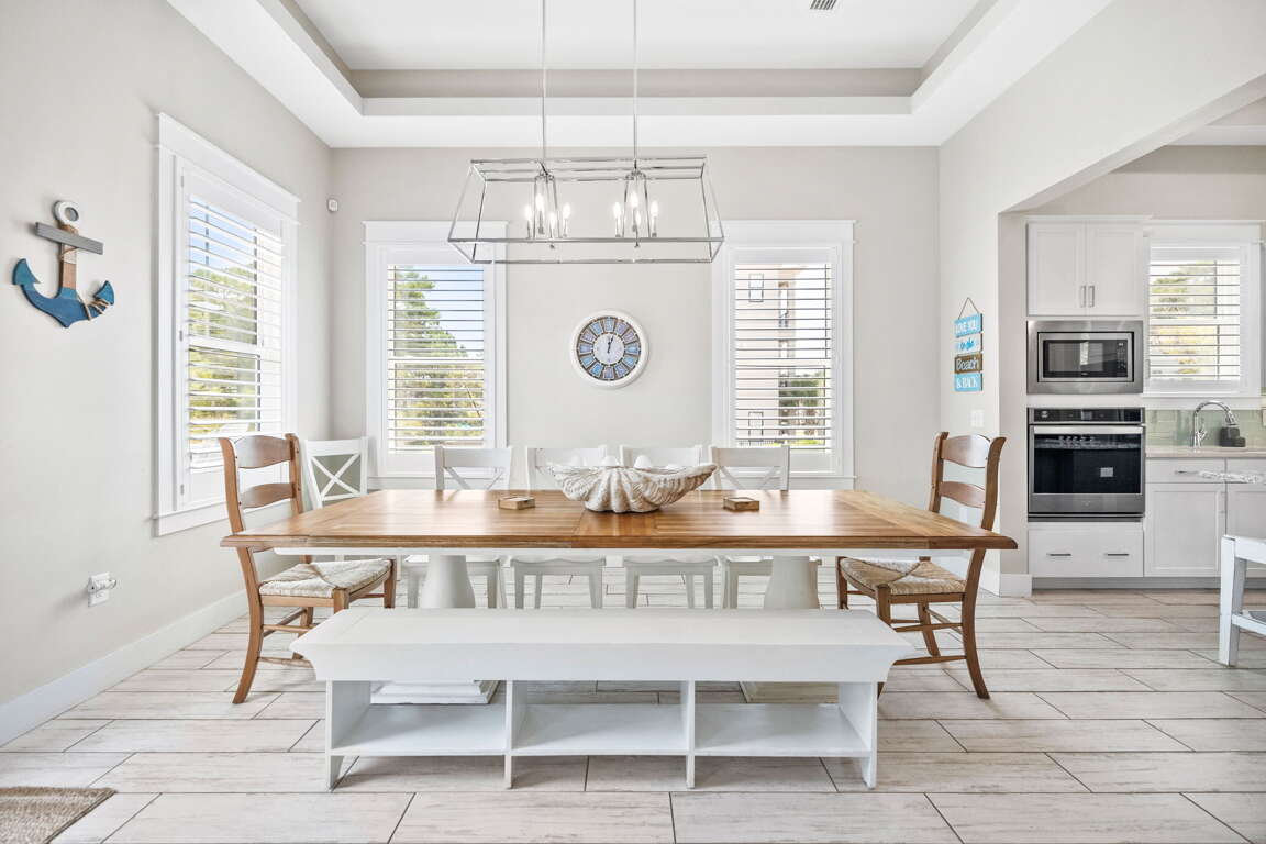 The bright corner lot lets in lots of natural sunlight and has classic, coastal curb appeal. Once inside, the main level great room is chic and laid-back, with not one but TWO plush sofas, a corner fireplace, a large HDTV, and lots of nautical-themed accent pieces. Next to the living area is a formal dining table with seating for ten, plus a kitchen island with seating for three more.