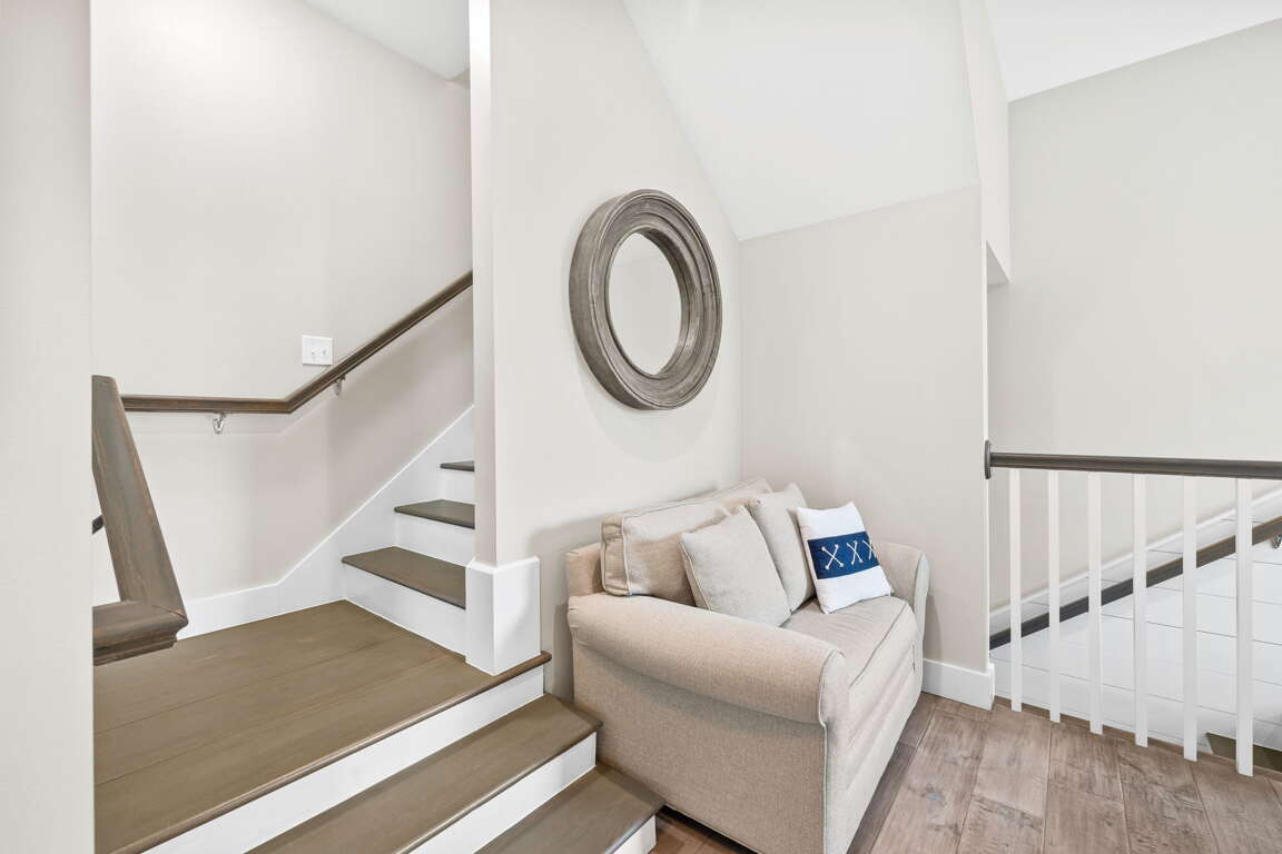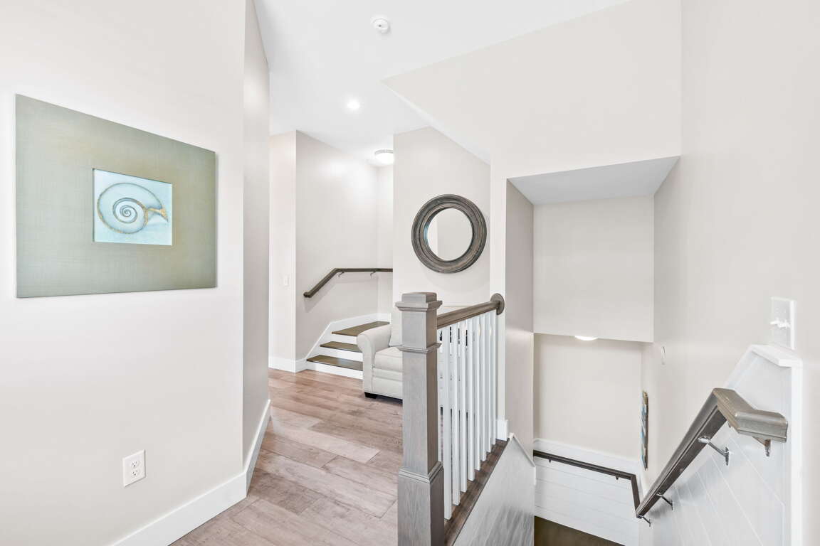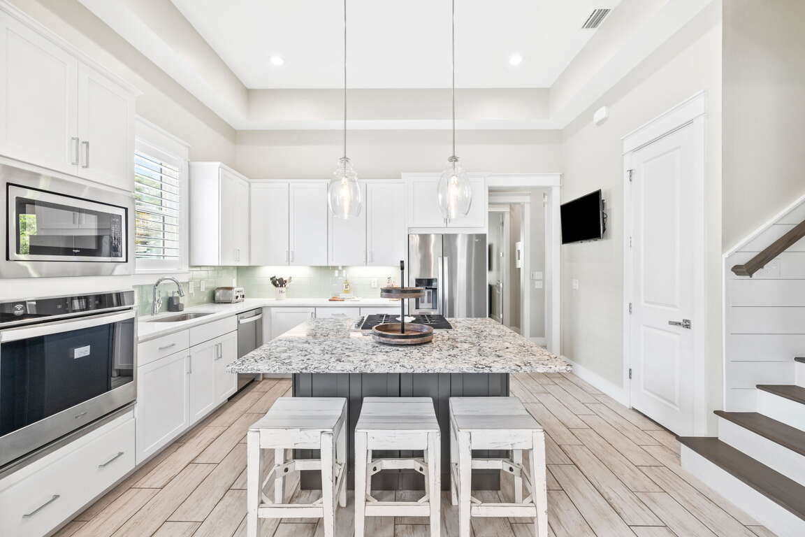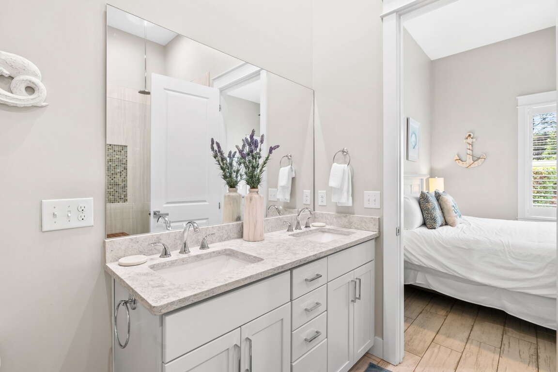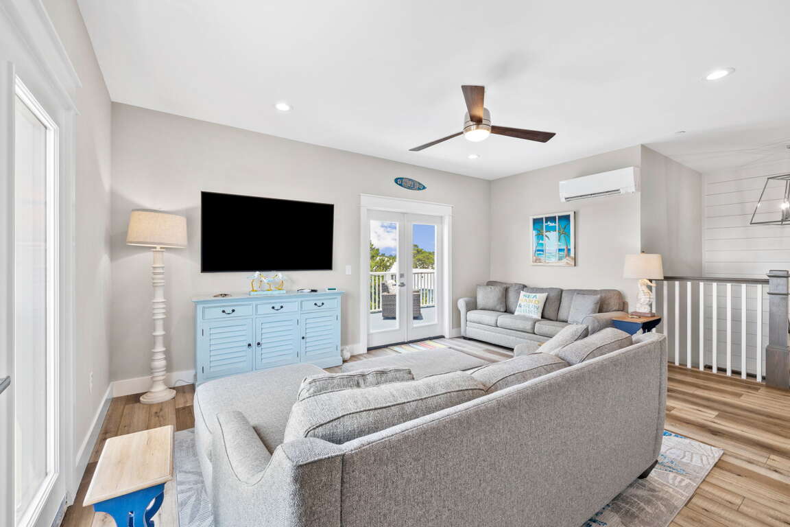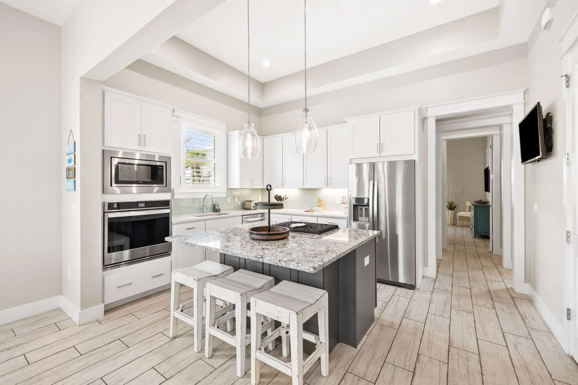 The bright corner lot lets in lots of natural sunlight and has classic, coastal curb appeal. Once inside, the main level great room is chic and laid-back, with not one but TWO plush sofas, a corner fireplace, a large HDTV, and lots of nautical-themed accent pieces. Next to the living area is a formal dining table with seating for ten, plus a kitchen island with seating for three more.