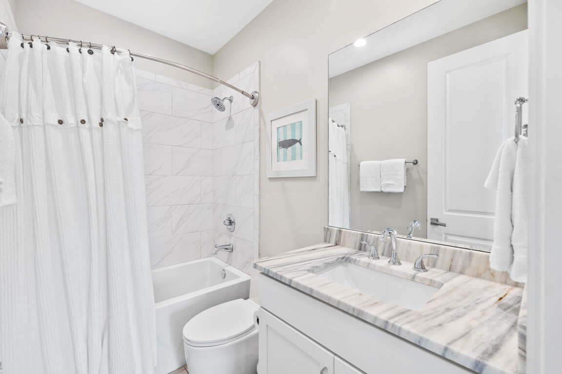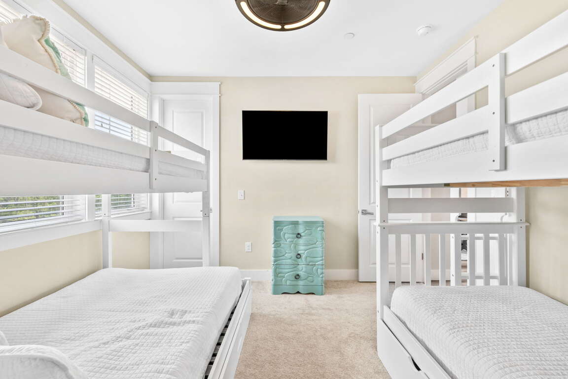 On the third floor, another inviting living area has multiple sofas, a large HDTV, and even a convenient wet bar with a fridge and a sink- perfect for sunset cocktails. Next to this amazing space is the fourth bedroom, a bunk room with two full-over-full-size bunk beds, and both bunks have twin-size trundle beds. The full bathroom has a tub/shower combo and a marble-topped vanity.