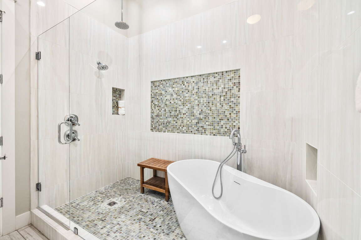 The first of three primary bedroom suites is just down the hallway and features a sumptuous king-size bed that faces an HDTV. The spacious ensuite bathroom has a huge wet room with a separate soaking tub and a shower area with multiple showerheads. The second and third primary bedroom suites also include king-size beds and delightful ensuite bathrooms with step-in showers.