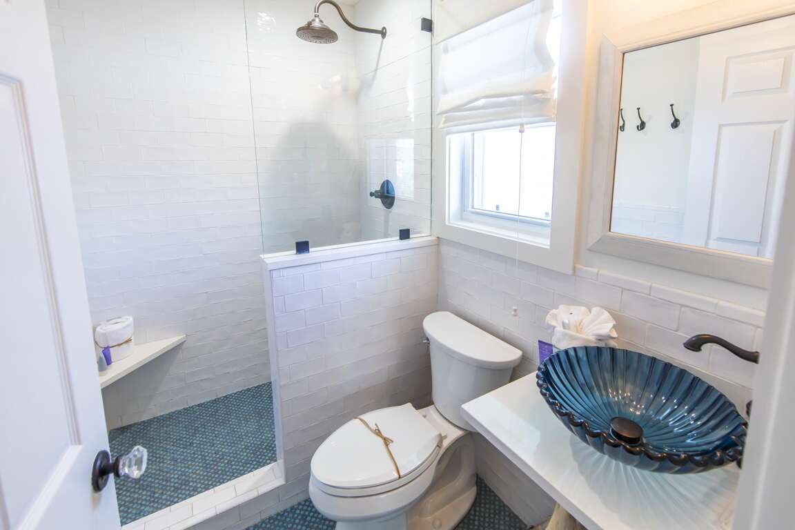 In the bedroom suite, a spacious king-size bed is surrounded by sun-filled windows. The ensuite bathroom features a step-in spa shower, a glass bowl vanity sink, and lovely, glossy subway tile walls with a blue penny tile floor.