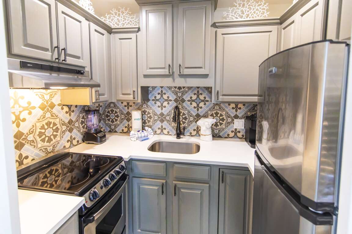In the living area, there’s a comfortable, slouchy sofa facing a large HDTV. Elegant armchairs, a dining table for two, and wood floors create an ideal space for lounging and relaxing after a day at the beach. Around the corner is an efficient galley kitchen, featuring chic gray cabinetry and stainless steel appliances accented with an artistic tile backsplash. The kitchen is loaded with all the amenities you need to prepare everything from a simple morning cup of coffee to a casual dinner at home.