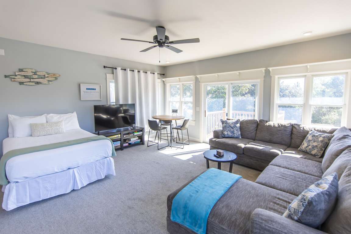 The loft area upstairs acts as a secluded sleeping and living nook with a comfortable bed, a large sectional in front of a smart TV, a dining table, a Keurig coffee maker, a mini-fridge, more board games, a private balcony, and en suite bathroom. The other three bedrooms are located downstairs.