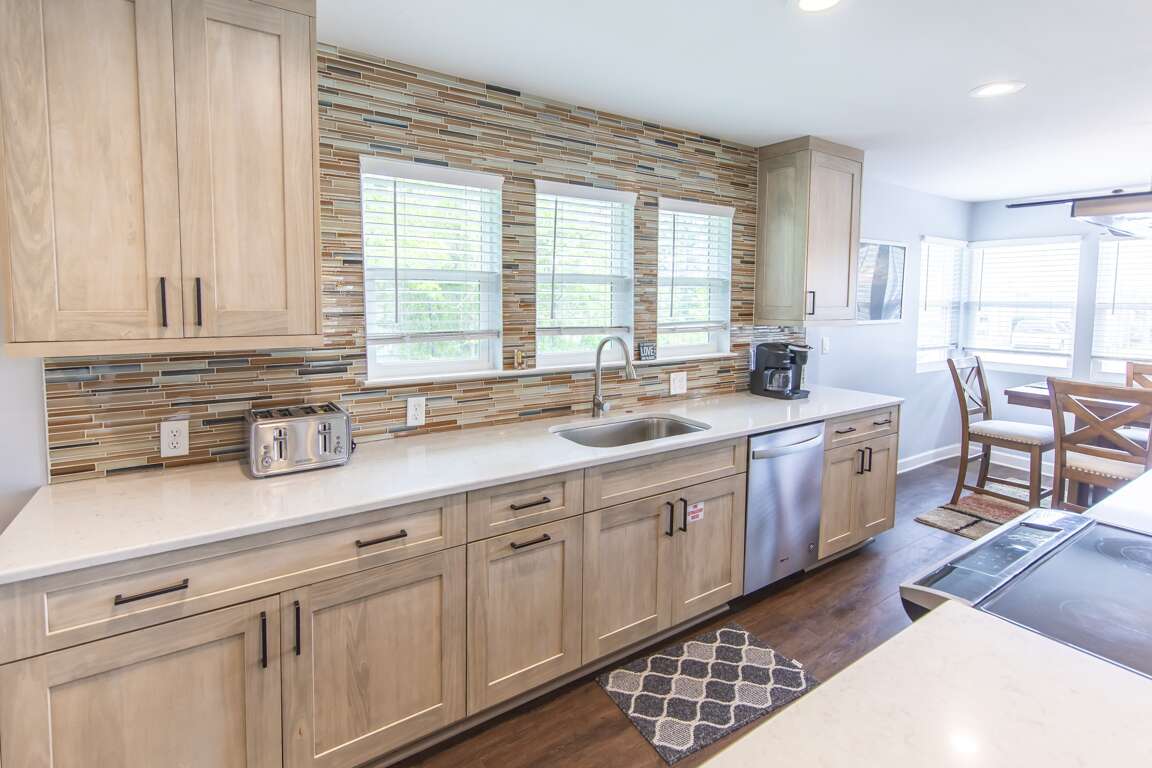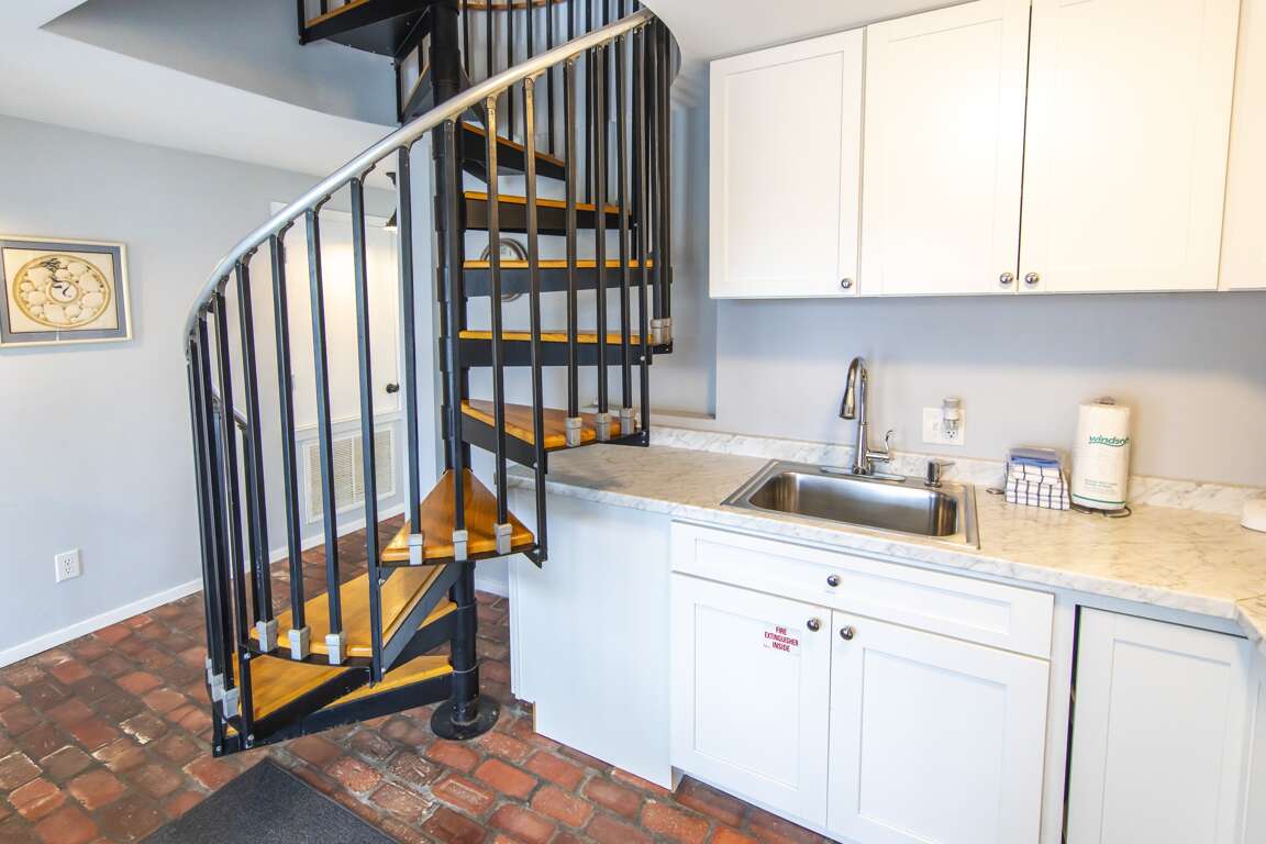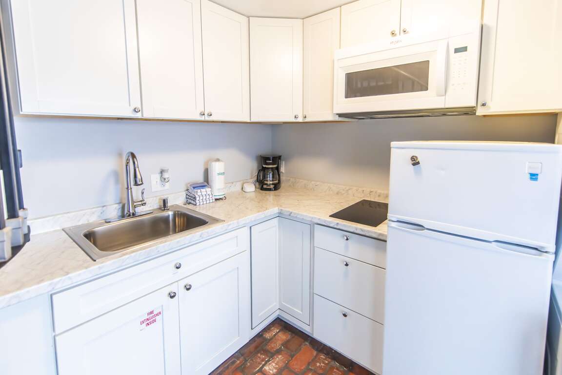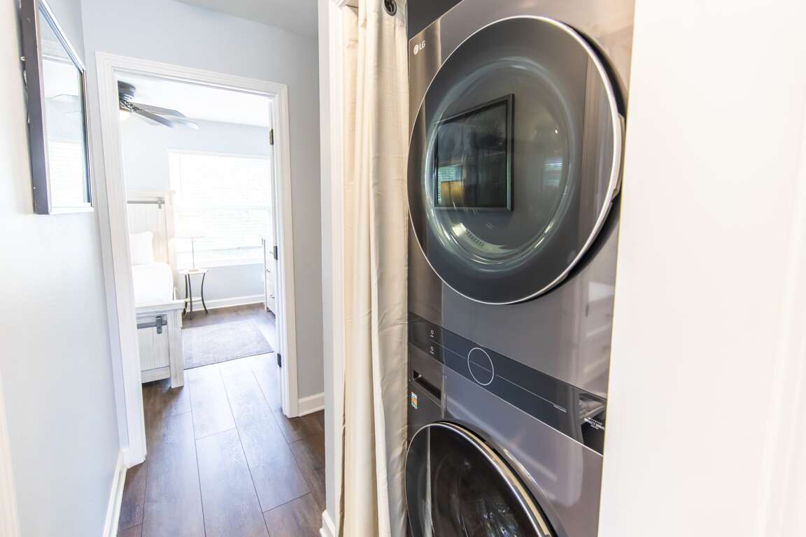 The interior has recently been remodeled, with a gorgeous modern kitchen that’s stocked with cooking supplies and has lots of comfy seating for when you’re dining in. There’s also a kitchenette area with a coffee maker and mini-fridge, plus two laundry areas.