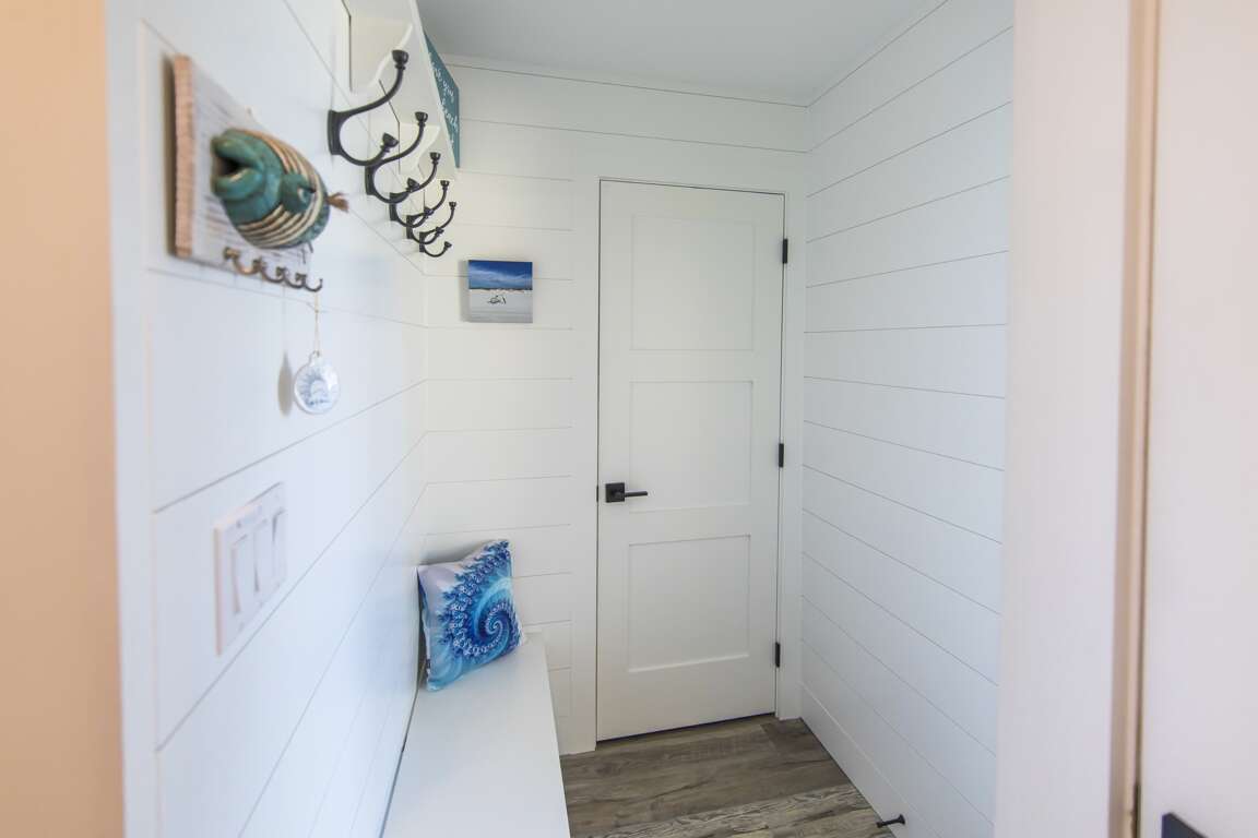 Upon entering the nautical-themed hallway, you’ll start to leave your worries behind. Vacation mode then takes over as you set foot in the bright and spacious living room. Here you'll find colorful, ocean-themed decor hanging over the large L-shaped sleeper sofa. Everyone will love relaxing together in front of the flat-screened tv after a day at the beach.